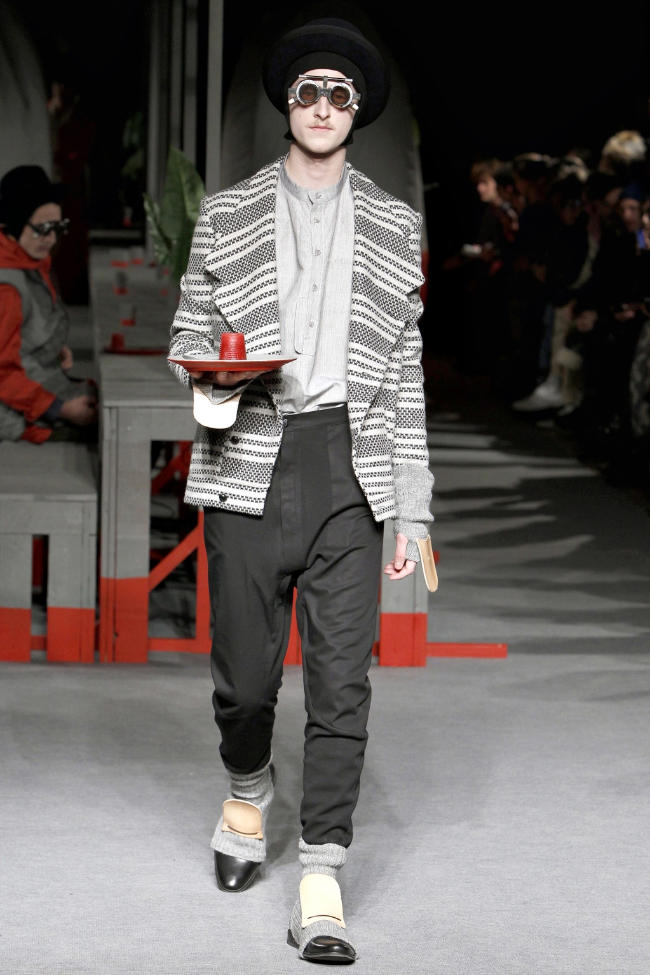Henrik Vibskov’s man managed to steal a moment from the mess hall for the designer’s latest Parisian outing. Rather subdued for Vibskov, muted colors fed into a somber mood that saw various hues of orange accenting a bleak palette. Making a statement with outerwear, enlarged proportions sat well against the label’s signature dropped crotch and narrow pants legs. Employing a minimal amount of prints, the collection’s focus remained on cut and details with outerwear providing a welcomed season of structure.