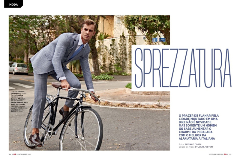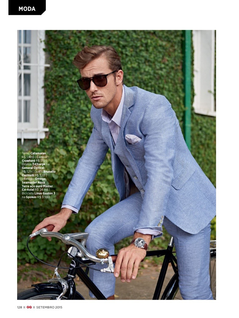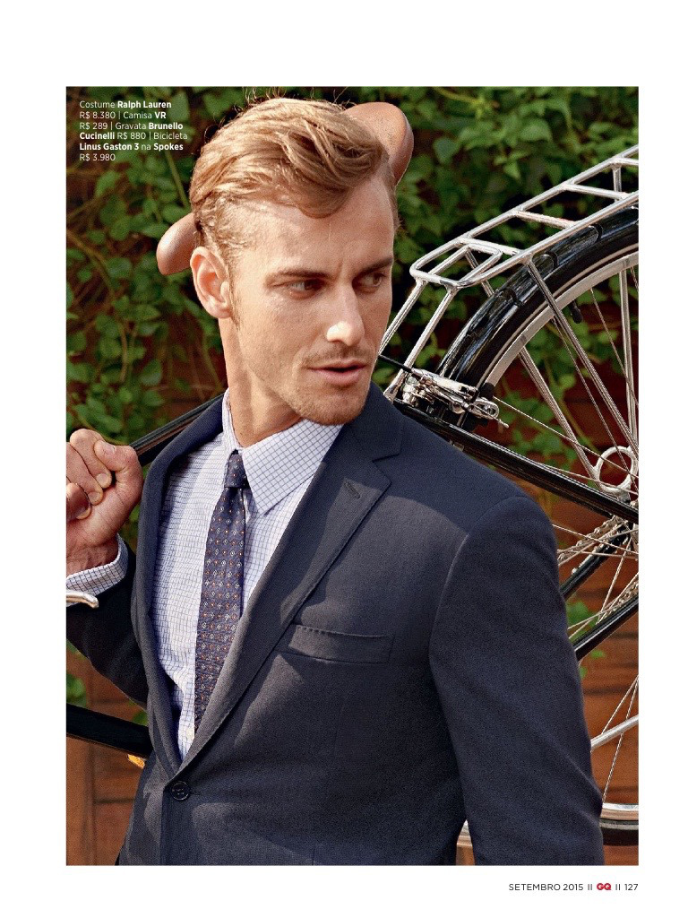 Henrique Hansmann goes for a bike ride as he graces the pages of GQ Brasil. Donning fine suiting from the likes of Salvatore Ferragamo, Henrique is styled by Sylvain Justum. Showcasing suits with impeccable tailoring on the slim side, Henrique is photographed by Tavinho Costa.