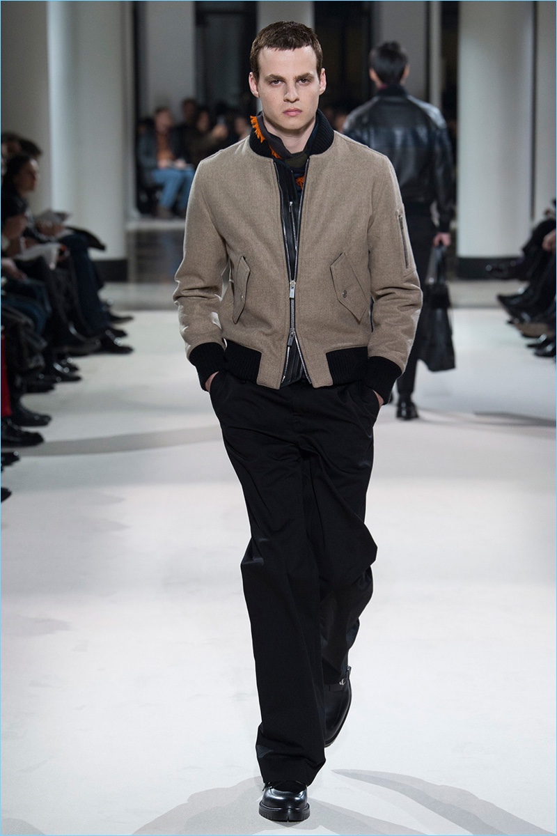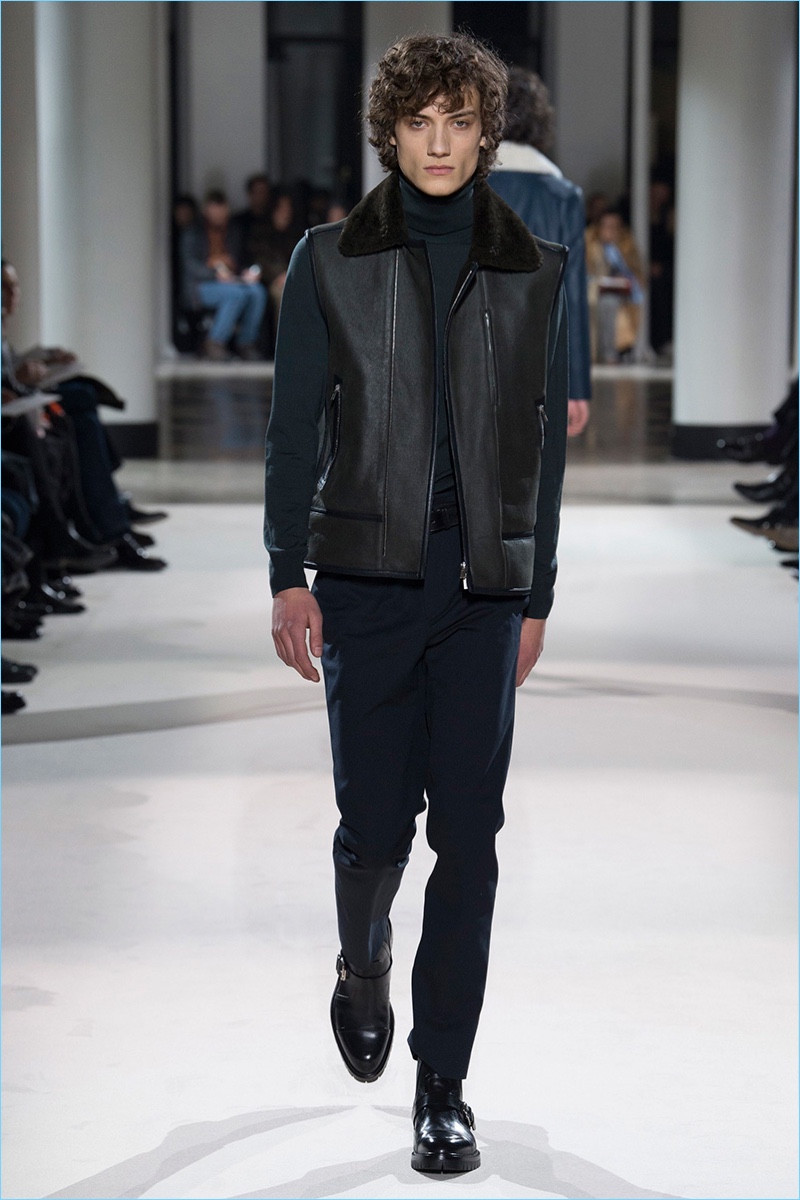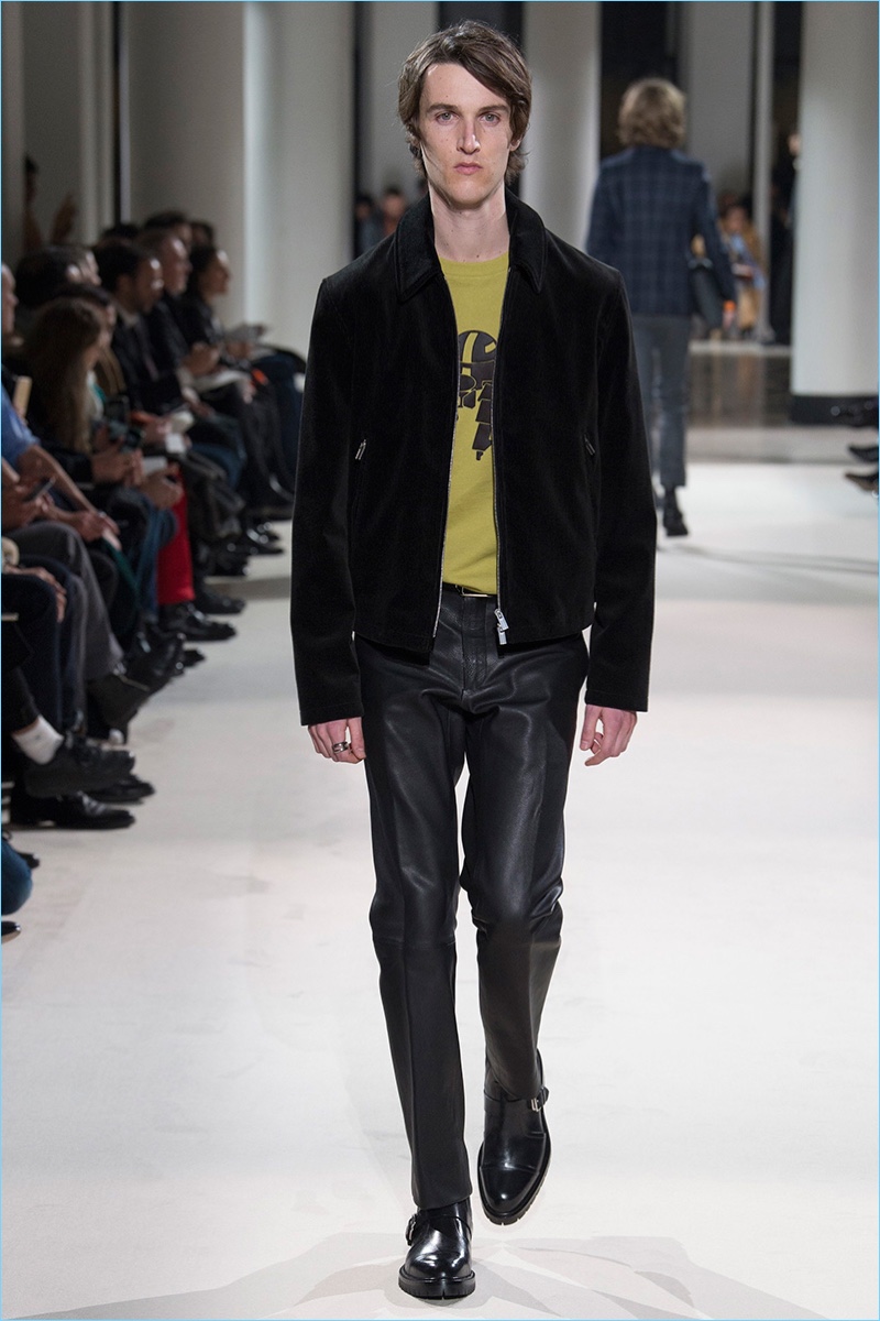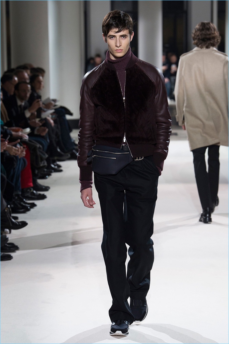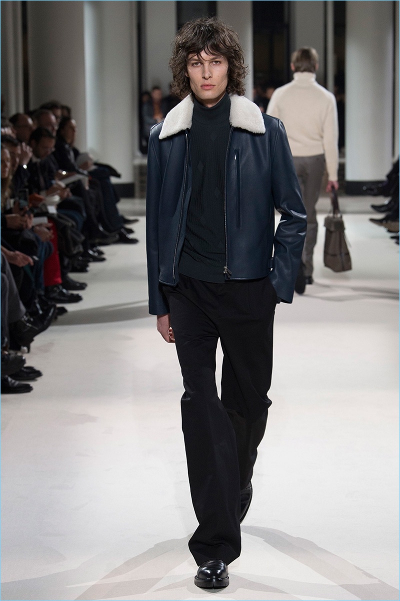 The fundamentals of menswear are alive and well when it comes to the fall-winter 2017 collection of Hermès. Sharp tailored plaid sports coats, monochromatic velvet numbers, houndstooth coats, and ribbed cashmere turtleneck sweaters were among the luxurious highlights. Once again, Hermès creative director Véronique Nichanian pulls together a seamless wardrobe for the French fashion house’s sophisticated man of style. Here, classics such as the aviator jacket fall in line with a tartan bomber update as well as leather pants and shirting.