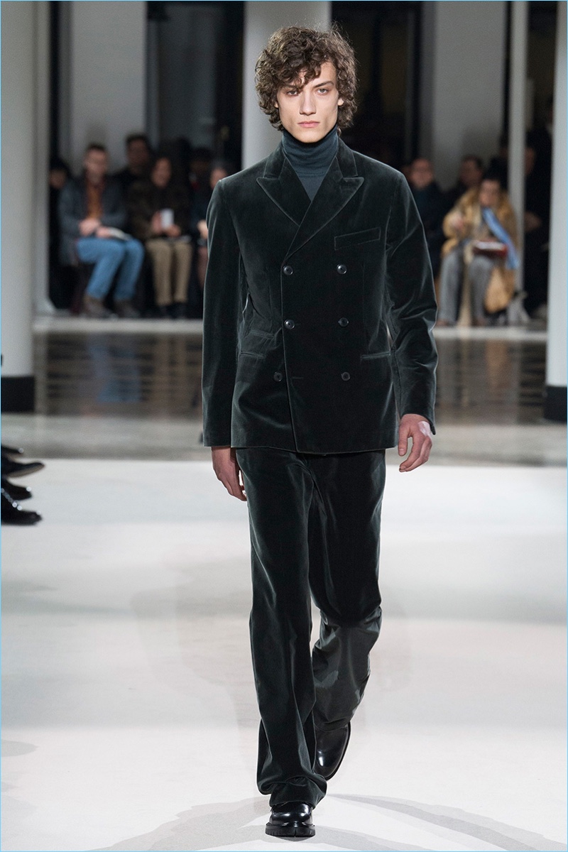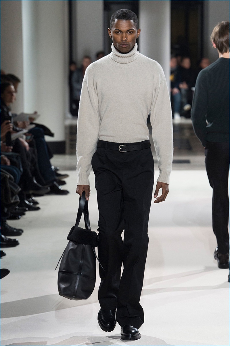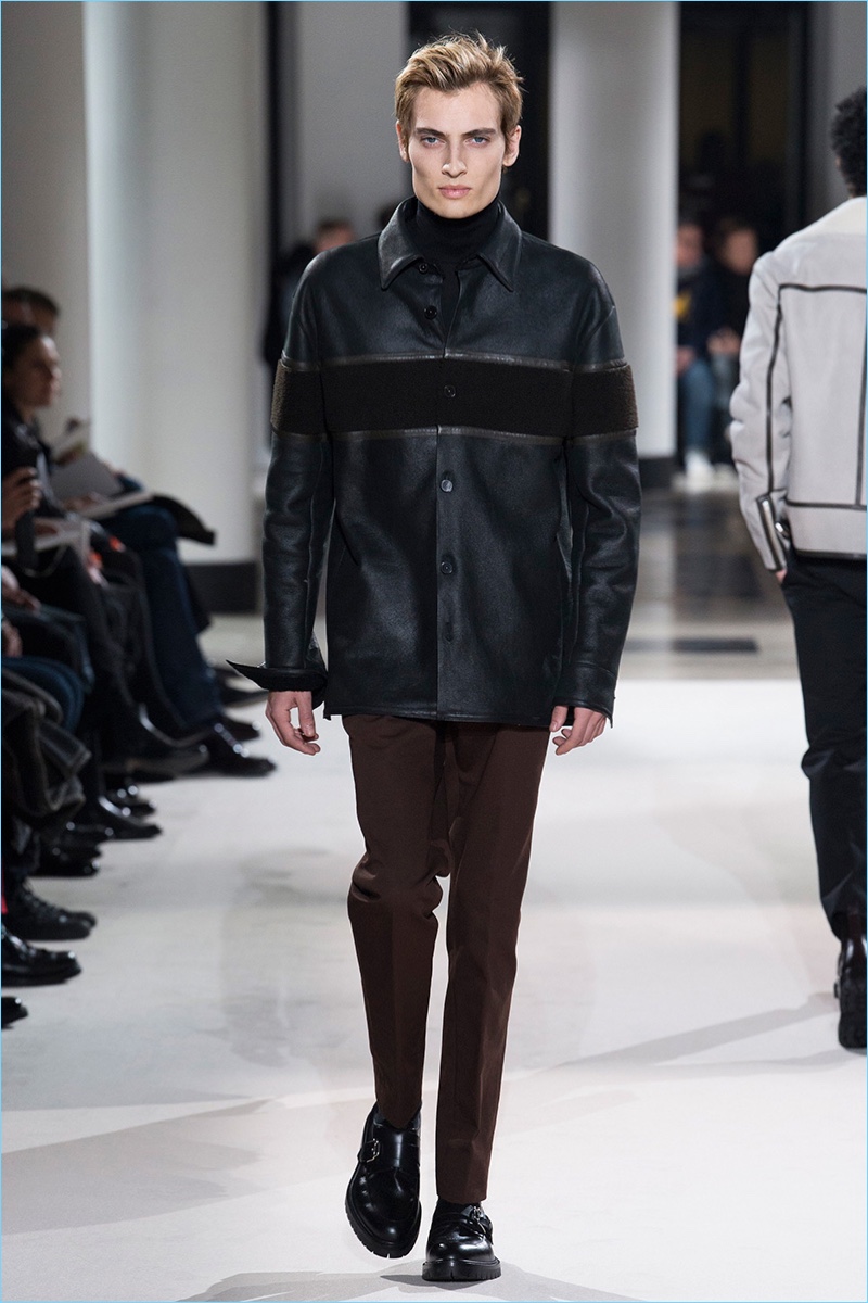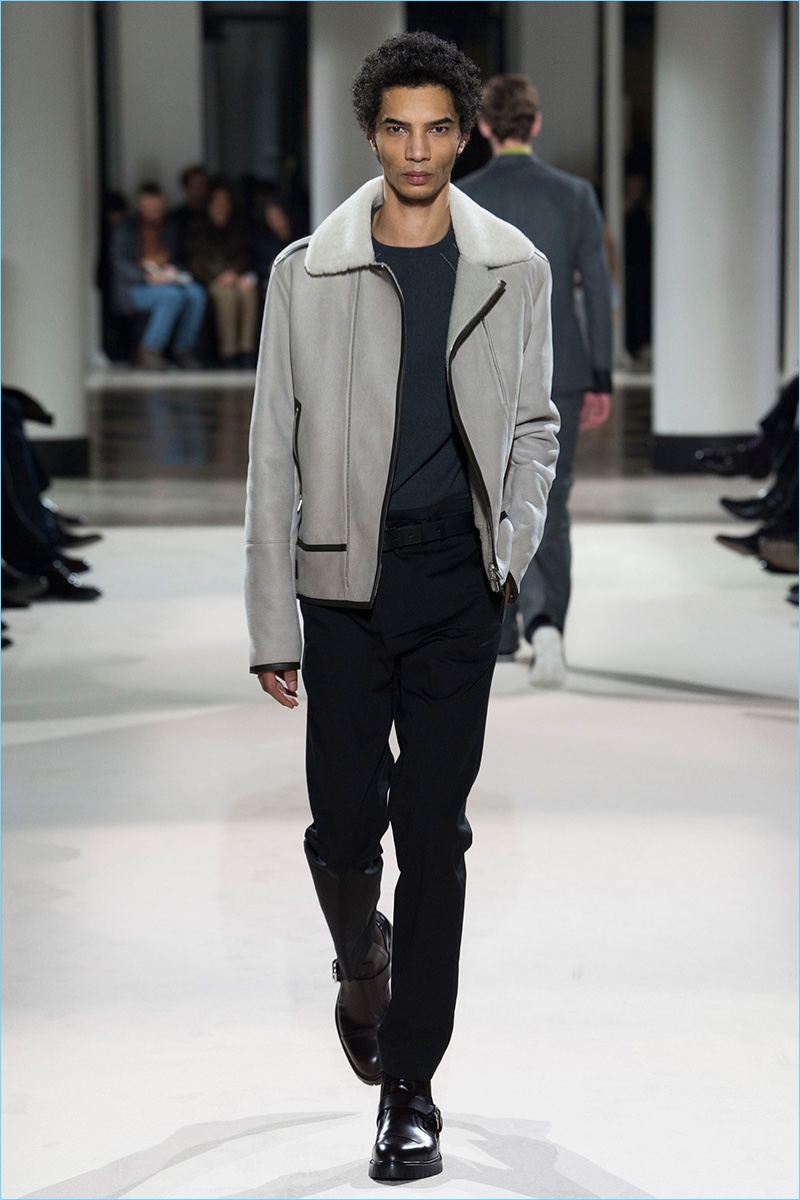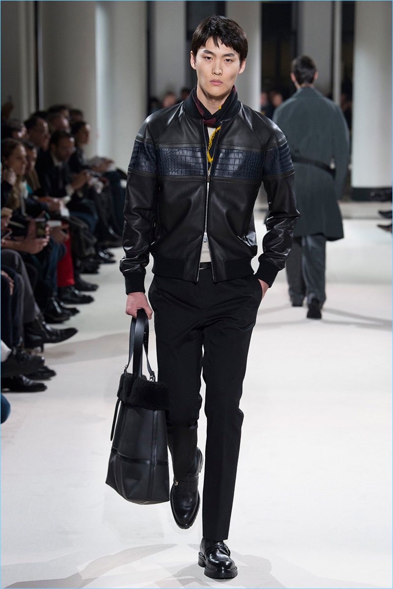 The fundamentals of menswear are alive and well when it comes to the fall-winter 2017 collection of Hermès. Sharp tailored plaid sports coats, monochromatic velvet numbers, houndstooth coats, and ribbed cashmere turtleneck sweaters were among the luxurious highlights. Once again, Hermès creative director Véronique Nichanian pulls together a seamless wardrobe for the French fashion house’s sophisticated man of style. Here, classics such as the aviator jacket fall in line with a tartan bomber update as well as leather pants and shirting.