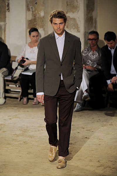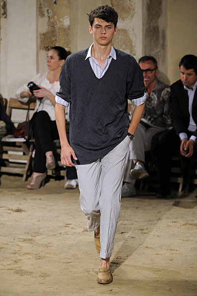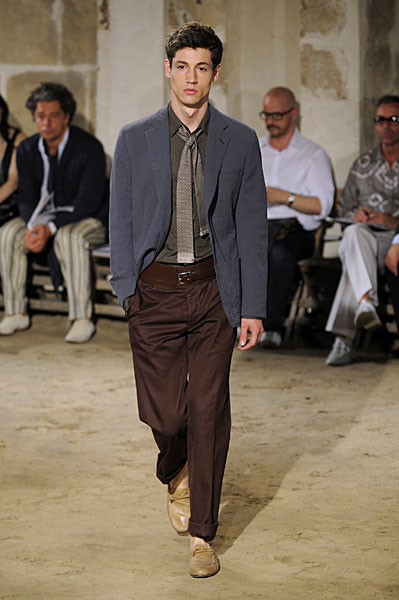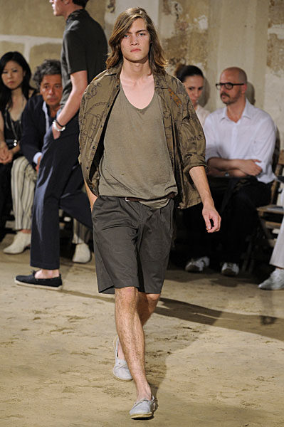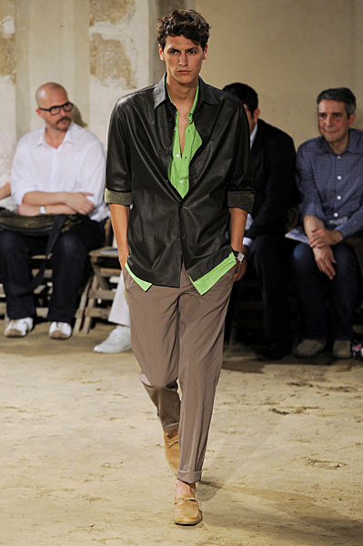 It might not be the most innovative spring collection, but Hermès hits a home run with their unexpected, but winning color combination of brown and gray. Thinking of the man on vacation, Hermès designer Veronique Nichanian delivered on a ready-to-wear range of relaxed classics. Spruced up by the French design house in easily accessible colors, the collection was styled with sharp scarves and subtle prints, while light open-weave knits, slouchy tanks and tees were topped off with the collection’s signature belt. All-inclusive, the collection is smart in that it fills a luxurious void for basics with valued longevity, while still remaining ultra-chic.