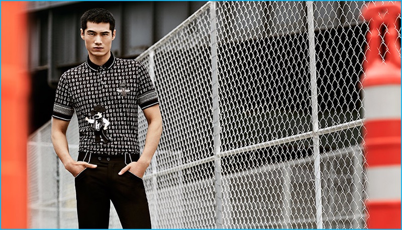 Hao Yun Xiang has a western moment in a cheeky polo shirt from Dolce & Gabbana.