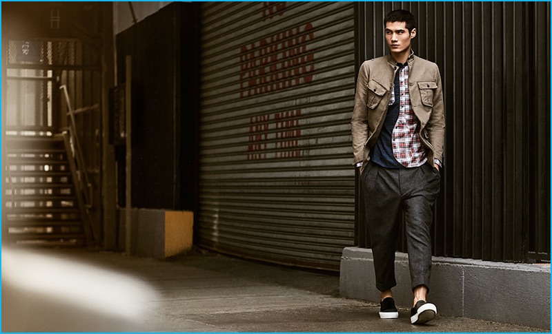 Hao Yun Xiang pictured in a military-inspired ensemble from Nick Wooster's ongoing collaboration with Lardini.Pin