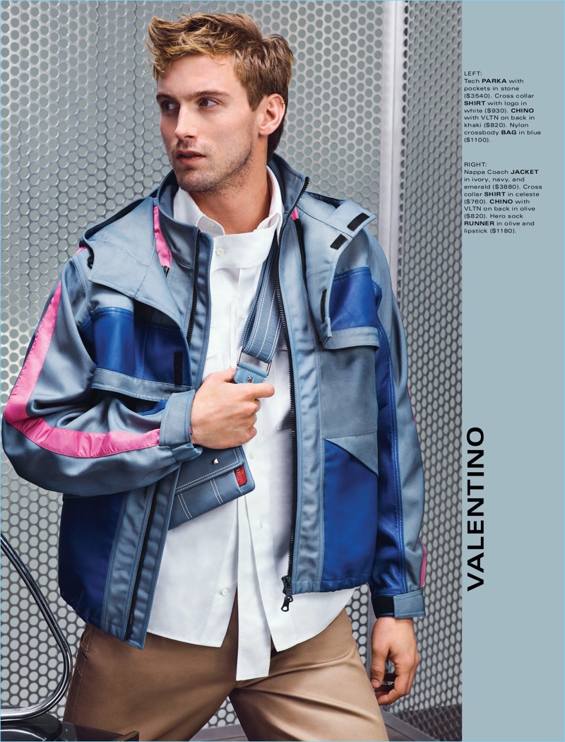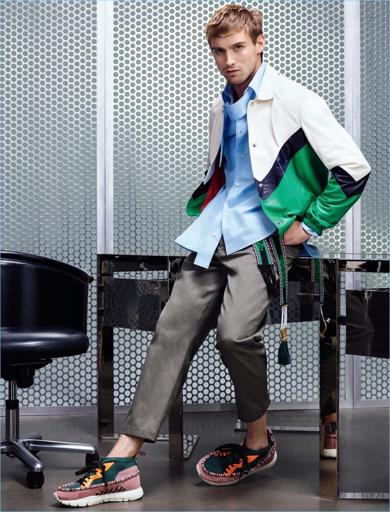 RJ King reunites with Holt Renfrew following an outing last year. This time around, the American model is in the spotlight for the retailer’s spring 2018 catalog. He embraces the athleisure trend with a designer interpretation. Bright colors and an array of brands come together for the outing. Taking to a fun set, RJ wears labels such as Balenciaga, Versace, and Marni. His wardrobe includes versatile items like the bomber jacket, single-breasted coat, and denim staples.