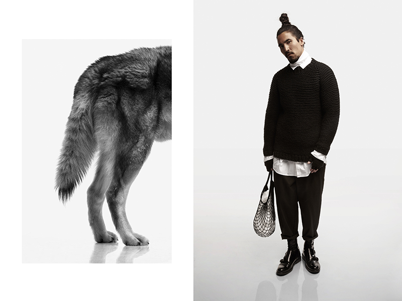 Photographer Andreas Bach unveils a stunning new shoot featuring Le Management fresh face Hossain Haidari. Posing for quite the set of images, Hossain is joined on set by a Tamaskan dog. Groomed by Pia Ankjær Poulsen (Le Management), Hossain’s hair is pulled up into a tight, coiled man bun. Dressed by stylist Mette Pors, Hossain gets a modern wardrobe update with covetable fashions from designer Mischa Toftgaard.