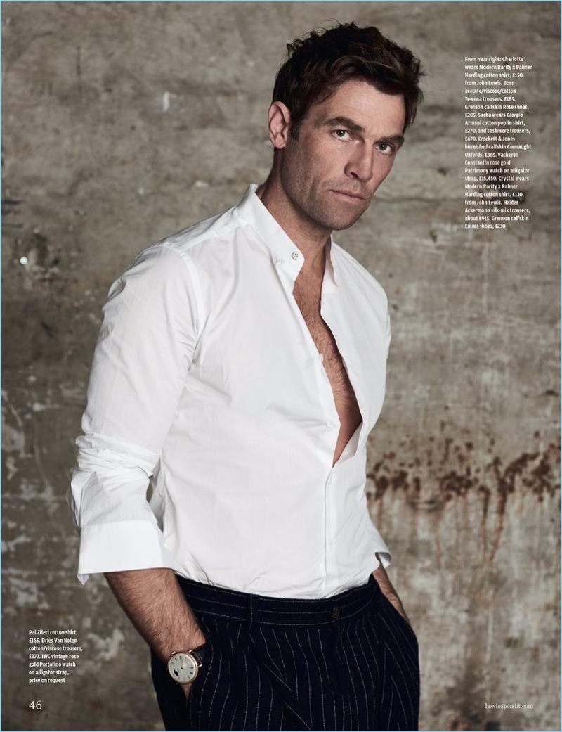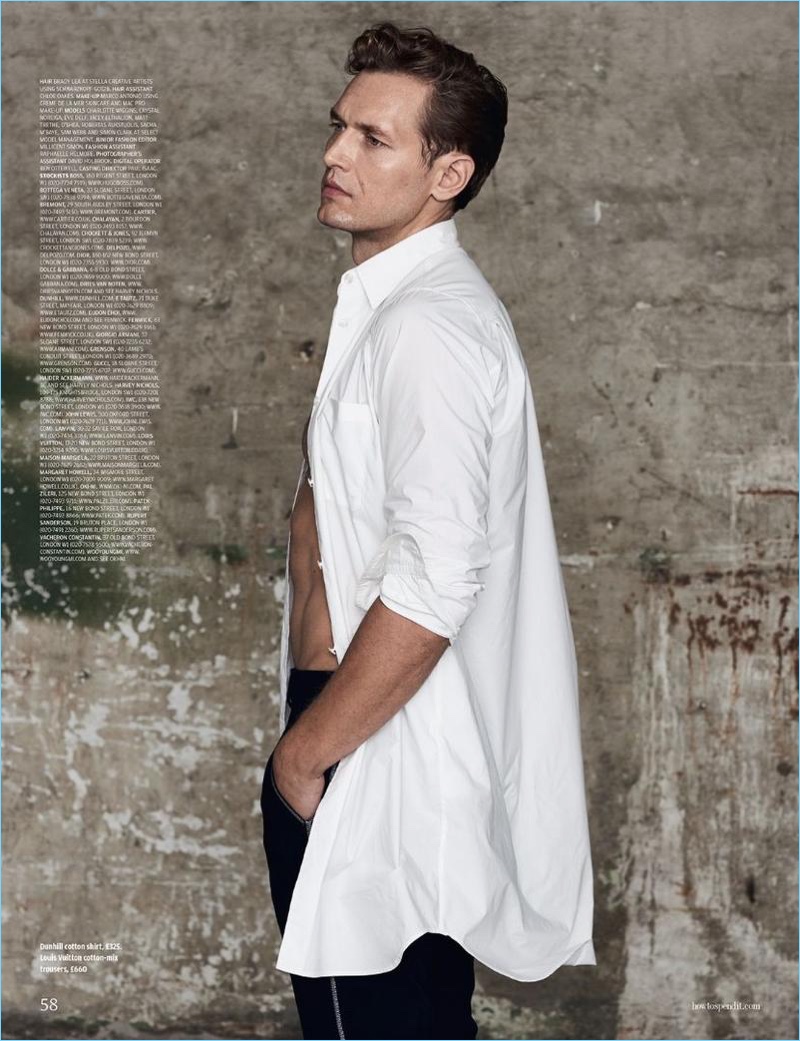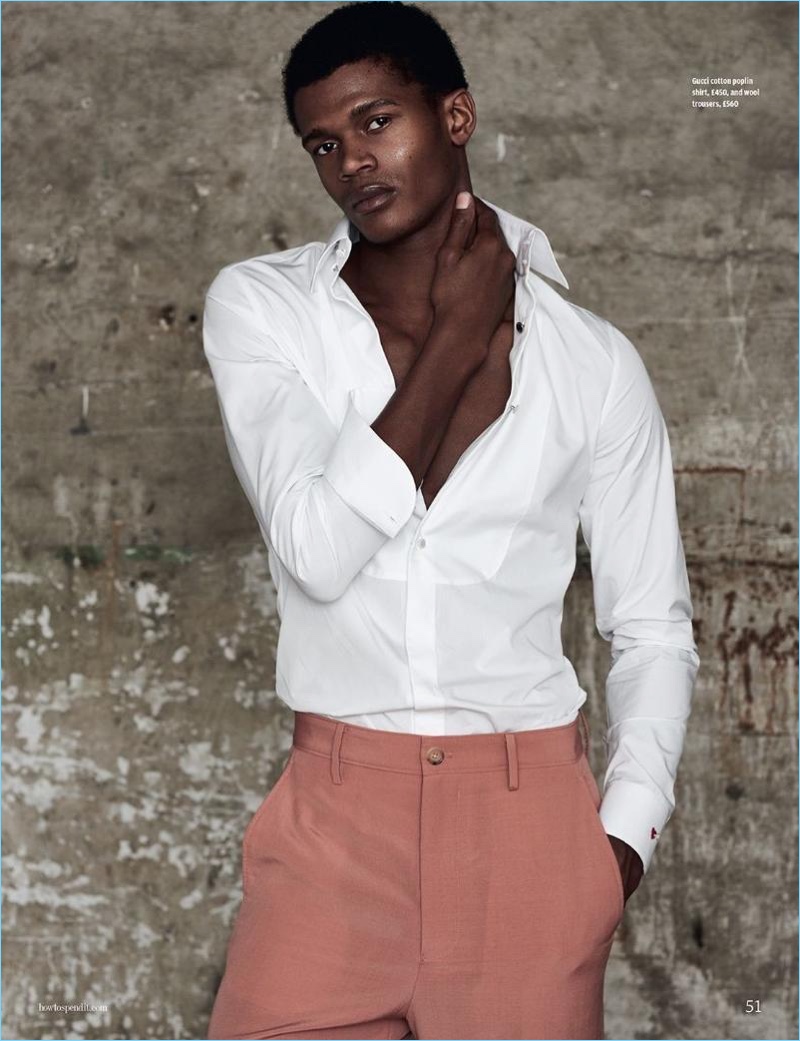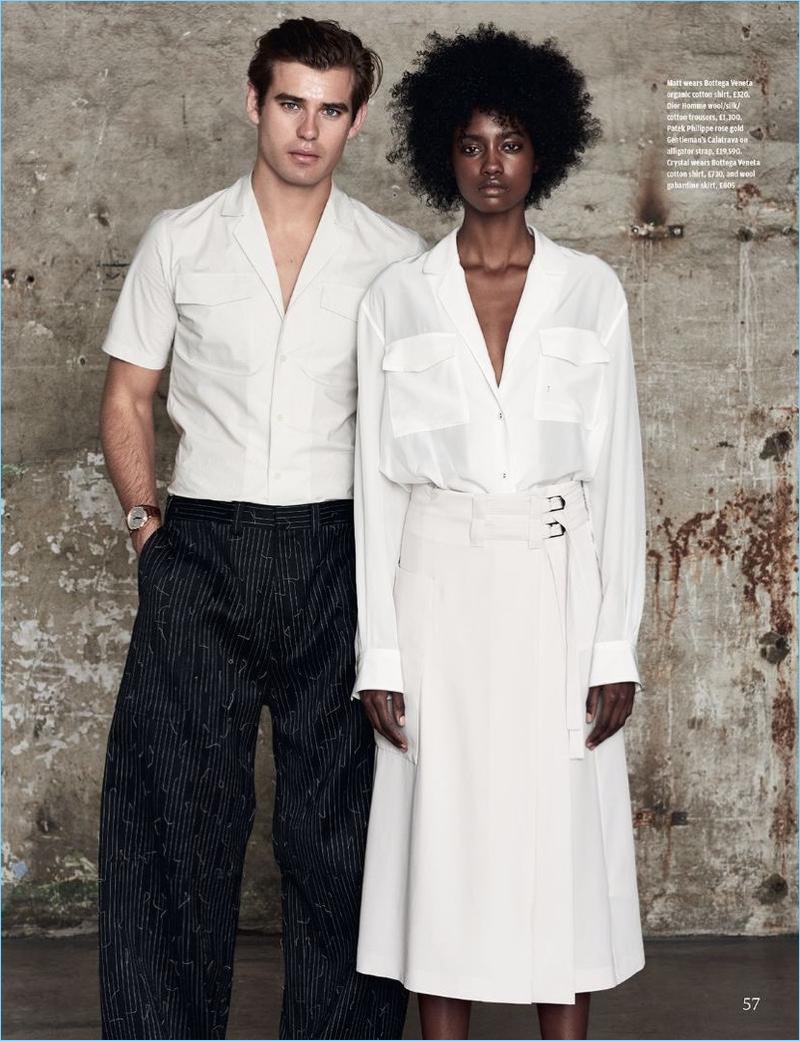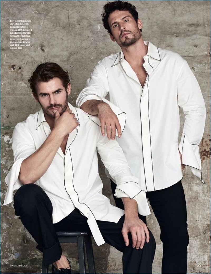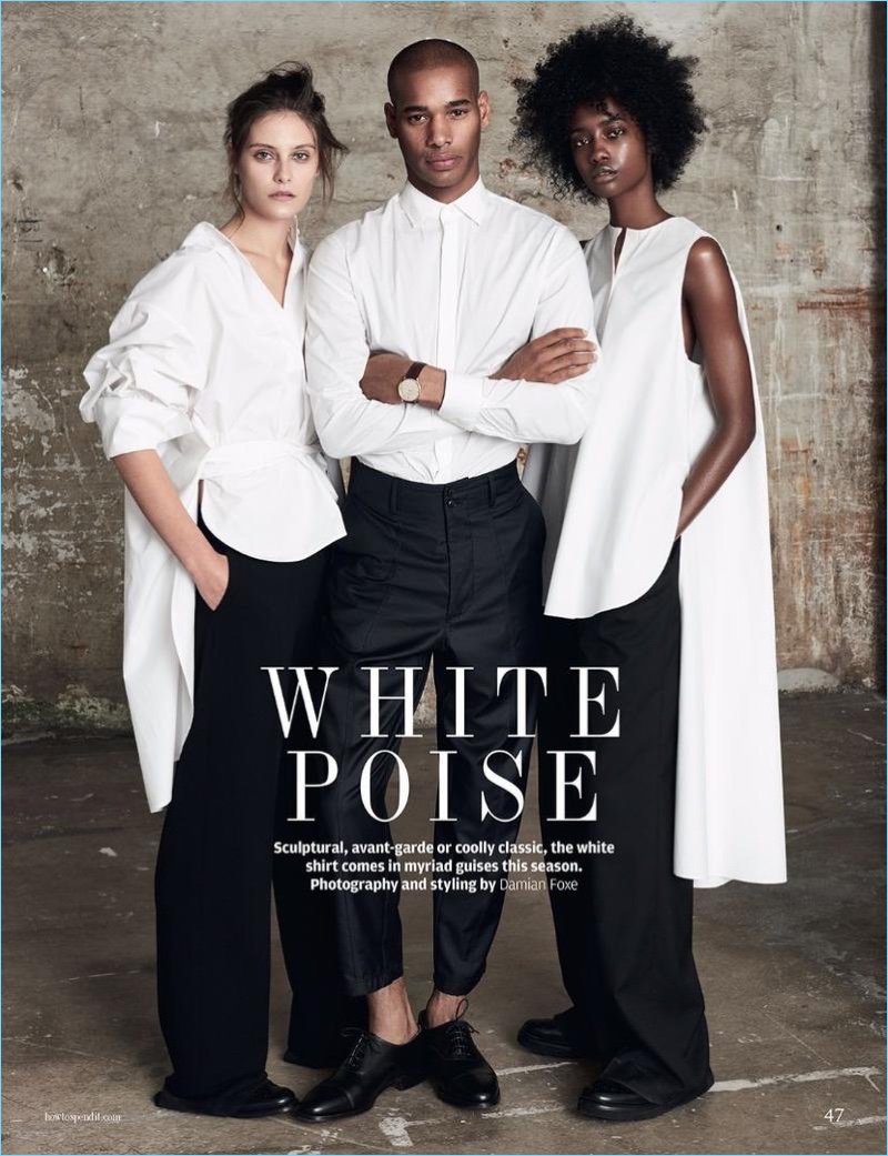 PinCharlotte Wiggins, Sacha M’Baye, and Crystal Noreiga don white shirts for the pages of How to Spend It magazine.PinO’Shea Robertson sports a white shirt and wool trousers by Gucci.PinSimon Clark models a white cotton shirt by Pal Zileri with Dries Van Noten pinstripe trousers.PinRobertas Aukstuolis wears an oversized white shirt with trousers from Dunhill.PinJacey Elthalion and Sam Webb wear white shirts with black contrast trim from Wooyoungmi.
