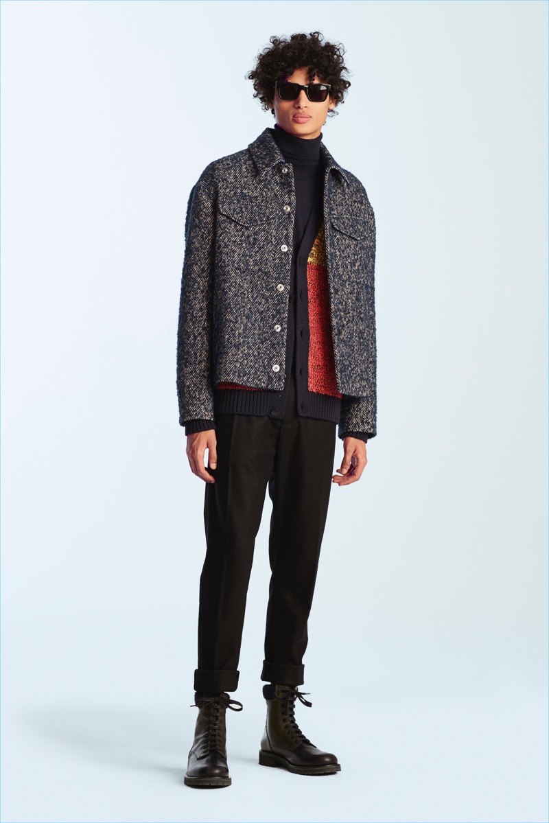 Embracing a sporty style motif, Long injects a wardrobe of turtleneck sweaters, hooded jackets, and tailored coats with bold colors and prints. Paired with cuffed denim and slim joggers, standouts range from cowl neck half-zip sweaters and decorated leather jackets to graphic pullover sweatshirts.