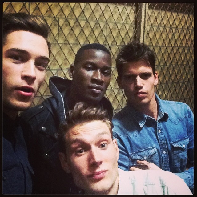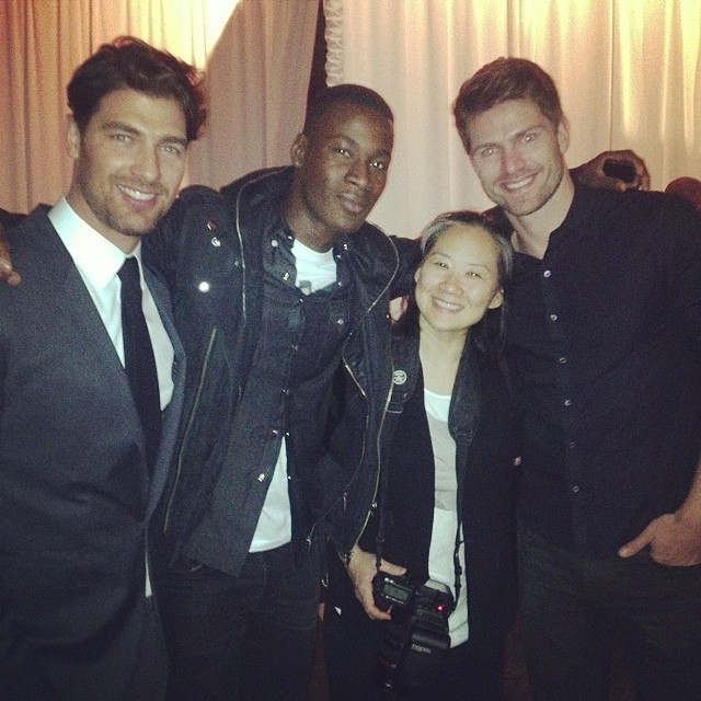 Cory Bond, David Agbodji and Michael Camiloto pose with Betty Sze of Models.com at Jeffrey Cares event.Pin