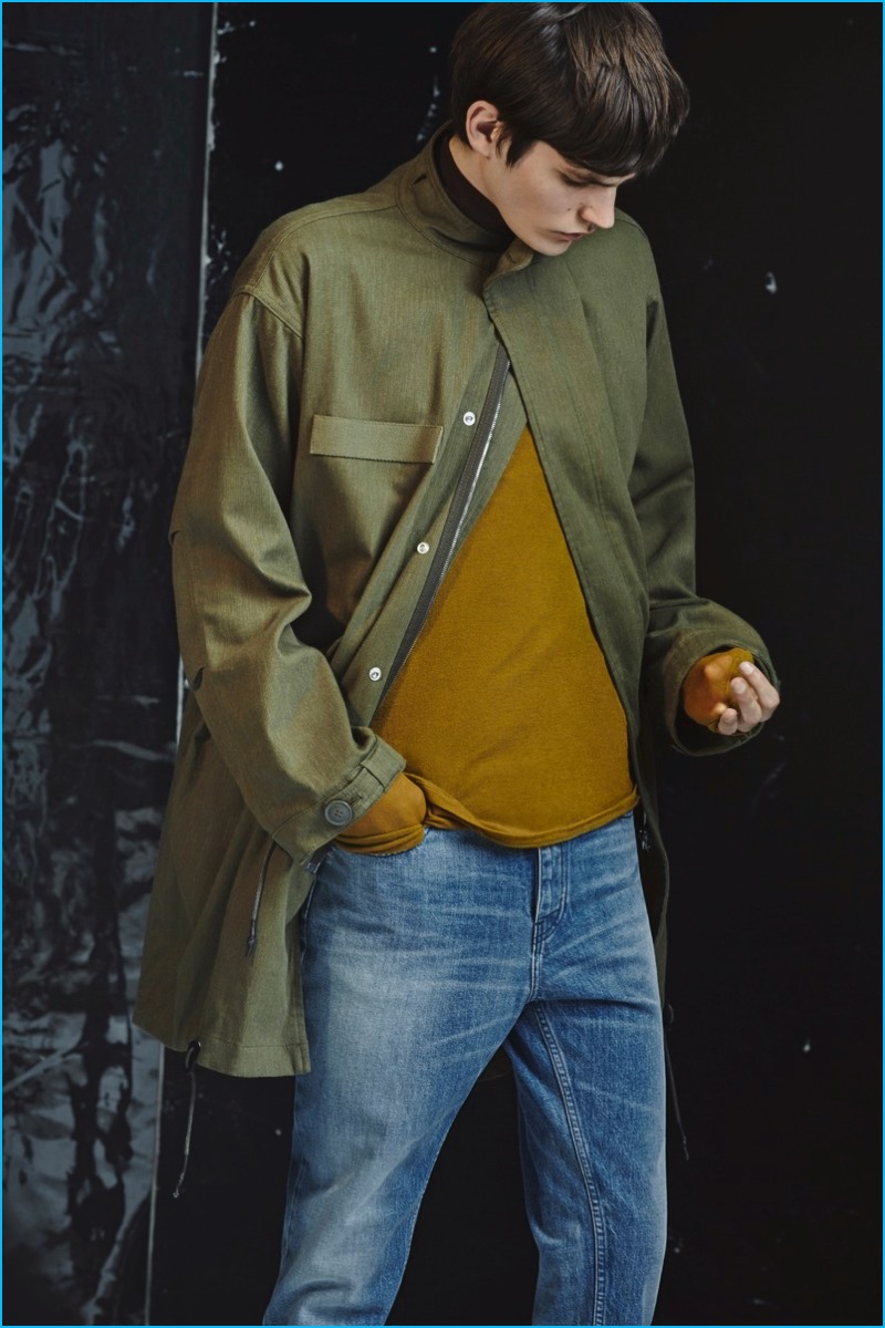 Wearing layers that feature modern proportions, Elias is styled by Emilie Kareh. Also appearing in IRO’s newest lookbook, Elias rocks a wardrobe that includes turtlenecks, plaid pullovers, light wash denim jeans, shearling outerwear, and oversized sweaters.