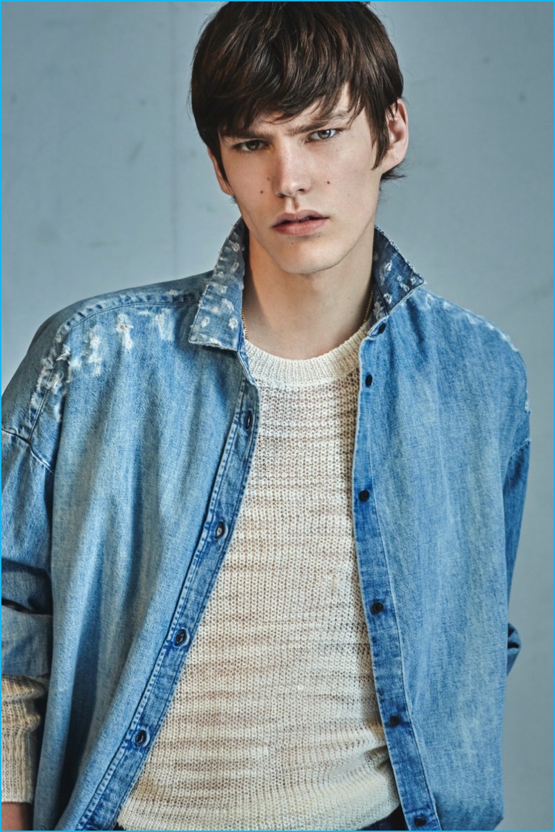 Elias de Poot is pictured in a distressed denim shirt from IRO's fall-winter 2016 collection.Pin