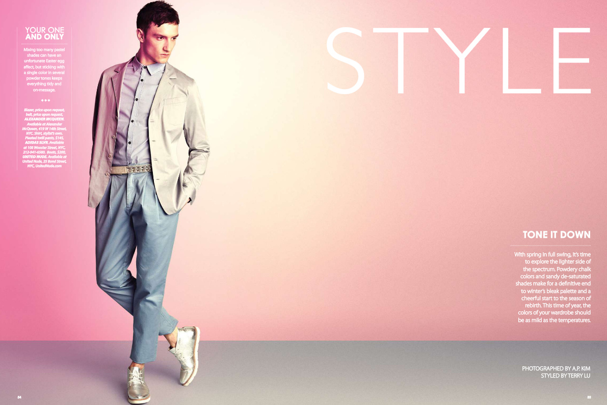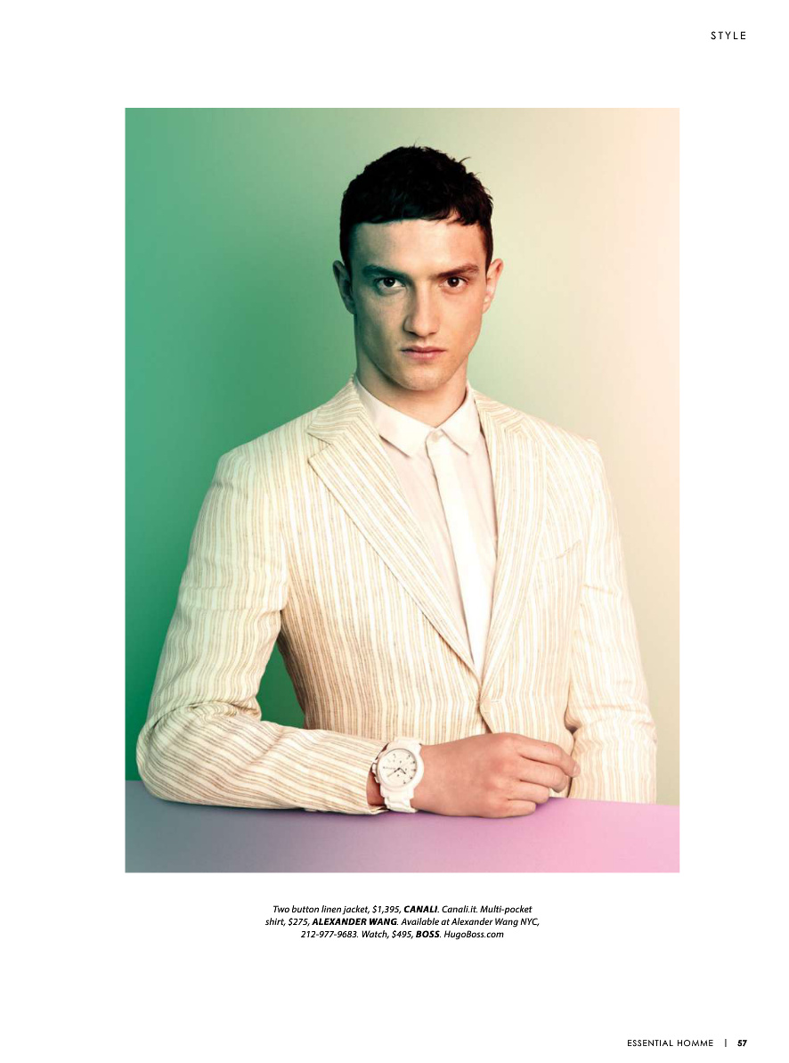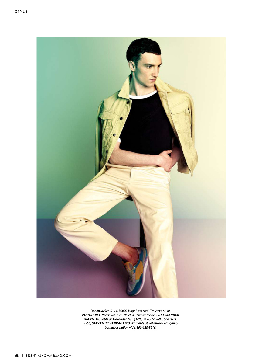The Shades of the Season–Photographer A.P. Kim and stylist Terry Lu join creative forces to shoot this stunning editorial, published in Essential Homme’s latest issue. Focusing the attention on this season’s light and powdery tones, forgetting for a while the bold trend of vibrant nuances, Kim captures VNY model Jacob Coupe in a selection of deconstructed jackets, slim fitted shirts and casual trousers. / Photography assistance by Justin Masanque. Styling assistance by Lisa O’Connor. Grooming by Jennifer Brent.