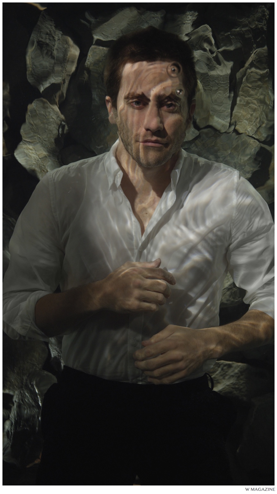 Jake Gyllenhaal Covers W Magazine–W magazine taps actor Jake Gyllenhaal for its December 2014 issue, which also doubles as its latest art themed edition. Gyllenhaal connects with video artist Bill Viola for a haunting cover image that shows the actor submerged under water in a simple black dress shirt. For the accompanying spread, Gyllenhaal swaps out his black shirt for a crisp white alternative.