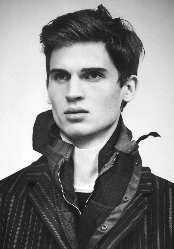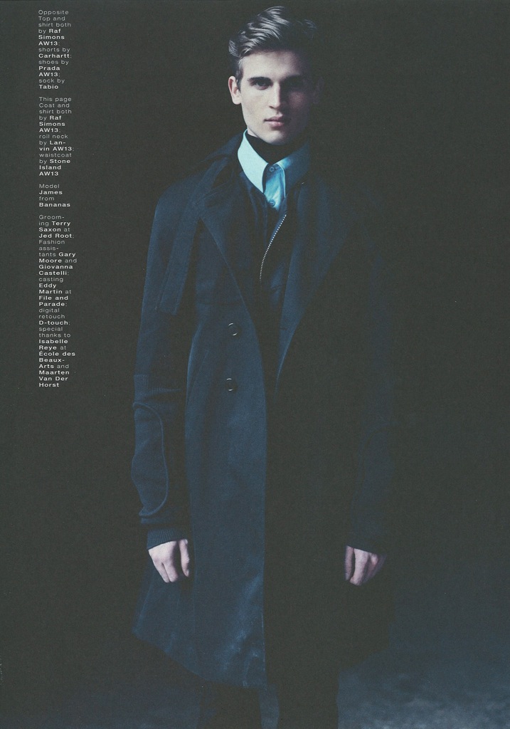 A Game of Layers–Exploring the many dimensions of layering, model James Gatenby (Bananas) is photographed by Matthew Brookes for the latest issue of Hero magazine. Unconventional layers and shapes takes control of this editorial spread, as James remains statuesque and poised in shapely coats, wide proportioned trousers, and an array of fabrics by labels such as Maison Martin Margiela, Dries van Noten, and Raf Simons, among others.