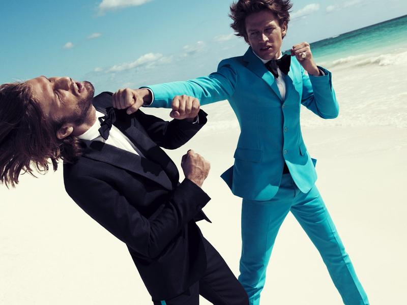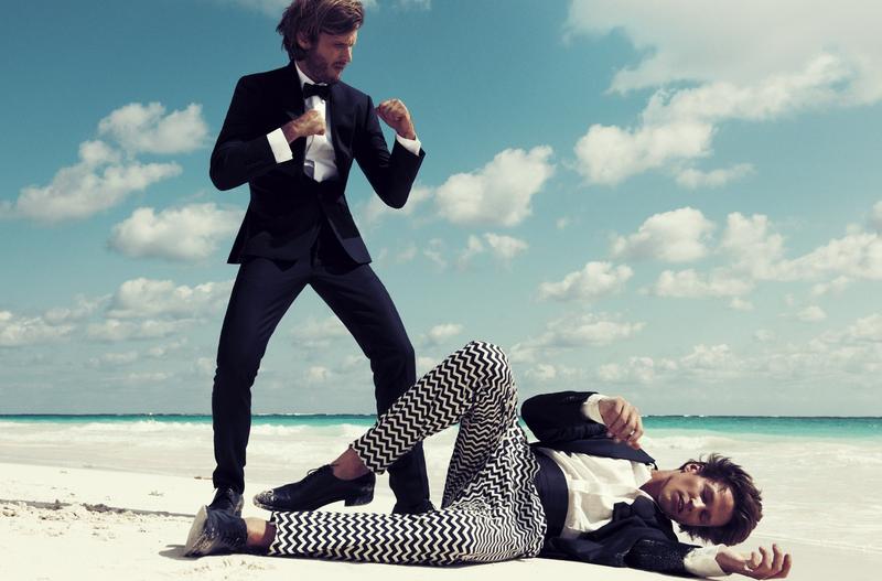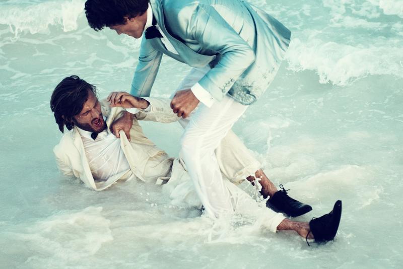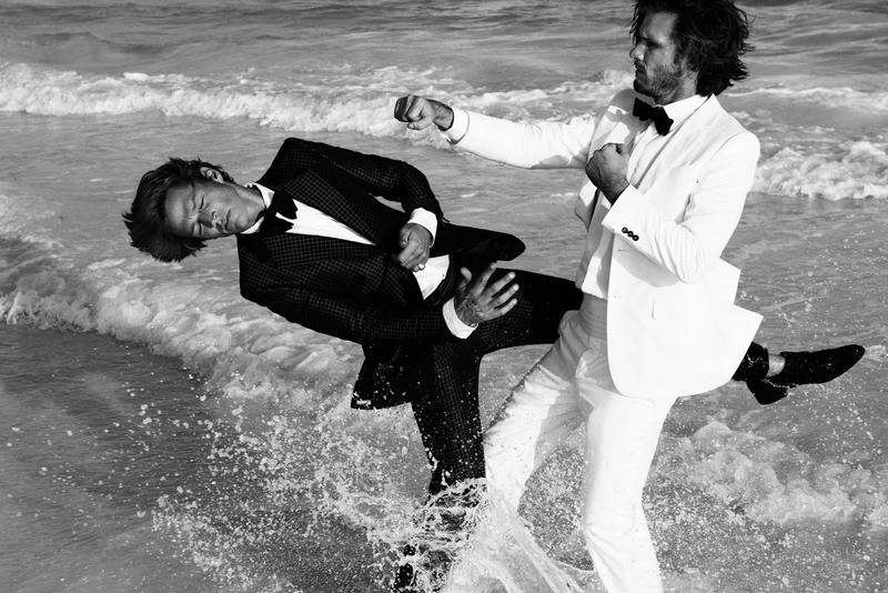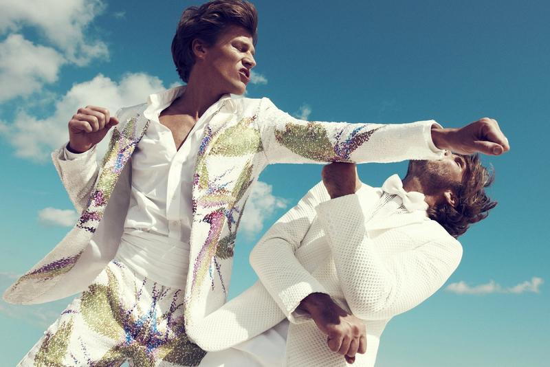 Fighting Spirits–For the latest issue of Hercules, fashion photographer Paola Kudacki captured male models James Penfold and Nico Malleville. Wearing a selection of spring/summer 2012 suits, including pieces from Bottega Veneta and Givenchy, the pair deliver a series of strong and combative poses that deeply contrast with the serene location. From bright and bold shades to geometrical patterns, including timeless black, navy blue and white, the male models display with a strong and virile attitude the latest way to embody elegance and refinement. / Styling by Keegan Singh. Hair by Sebastien Richard. Makeup by Alice Lane.