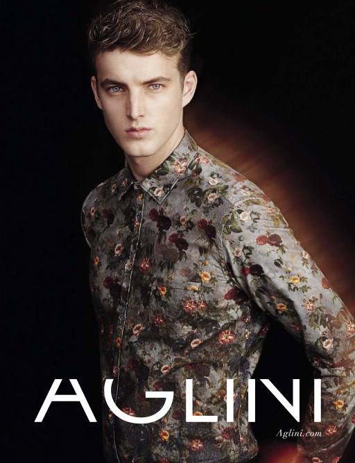 Aglini Fall/Winter 2014 Campaign–Fashion brand Aglini taps British model James Smith to front its fall/winter 2014 campaign. Posing for strong images that place the model against a stark black background, the focus is on Aglini’s fall shirts as James sports a shirt with an intricate floral print as well as a quintessential denim shirt.