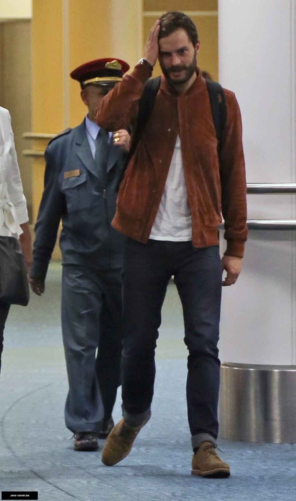 Arriving in Vancouver on October 11, 2014, Jamie Dornan showcased a smart casual ensemble with selvedge denim jeans and a classic white t-shirt paired with a suede bomber jacket and shoes. Dornan is in town to reshoot scenes for ‘Fifty Shades of Grey’, which comes out February 14, 2015. See more images at Jamie-Dornan.org.
