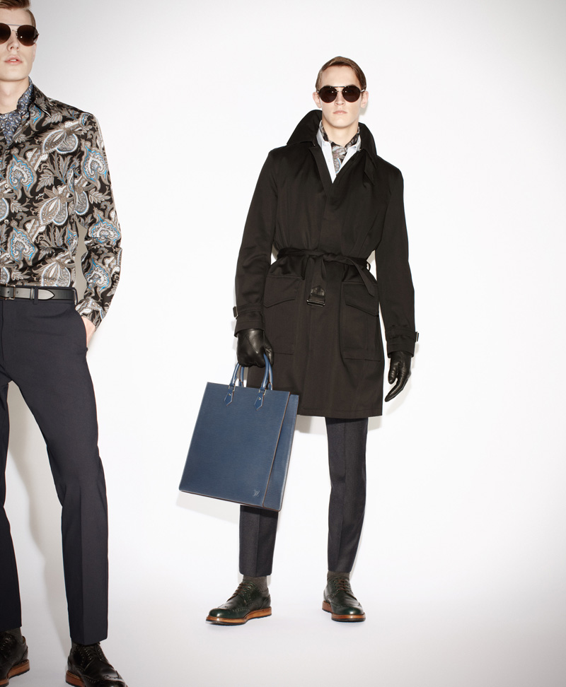 Everyday Luxury–Sporting slicked-back hair and an impeccable wardrobe, models Janis Ancens and Rutger Schoone are enlisted for the fall/winter 2013 pre-collection lookbook of Louis Vuitton. Embodying the essence of relaxed luxury, menswear designer Kim Jones employs relaxed tailoring for slim suiting separates juxtaposed with sharp sportswear. From a revamped bomber jacket and printed dress shirts to leather loafers, the man of Louis Vuitton gains versatile wardrobe additions. Turning an eye to cold winter adventures, chunky cable-knit sweaters, leather hiking boots, parkas and more make a well-informed splash, which is sure to only be heightened by next month’s presentation of the main collection.