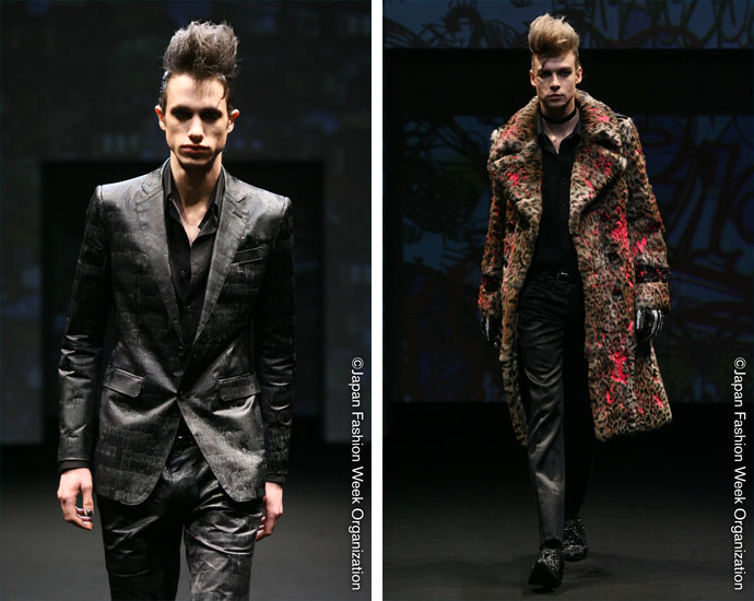 apan Fashion Week has quietly come and gone. Opening Monday, March 23, 2009 and coming to a close yesterday, the week featured a generally subdued color palette, but did not disappoint in the drama factor. The fall collection from Gut’s Dynamite Cabarets was infused with rocker spirit and a slight attempt at humor. The standout piece of the show was an exhuberant leopard fur coat flocked with faux paint in protest. On the other hand, Heath played it modest by enhancing traditional pieces with modern details like the oversized cowl neck. Rounding up this glimpse at Japan Fashion Week is @Izreel with their elongated collection of gray and black that mixed streetwear with formal attire.