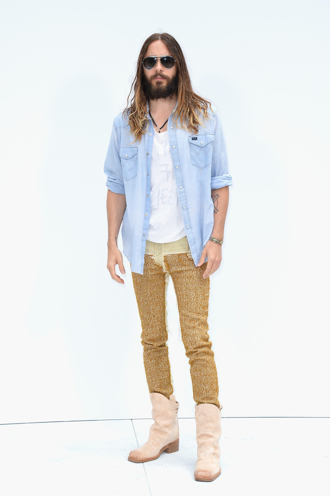 Jared Leto in Chanel-Not afraid to borrow from womenswear, actor Jared Leto made a front row appearance at Chanel’s recent fall/winter 2014 haute couture show during Paris Fashion Week. For the event, he paired a denim shirt and inside-out t-shirt with a pair of slim-cut pants and boots from Karl Lagerfeld’s Paris-Dallas collection for Chanel. What do you think of the look? A big hit or miss?