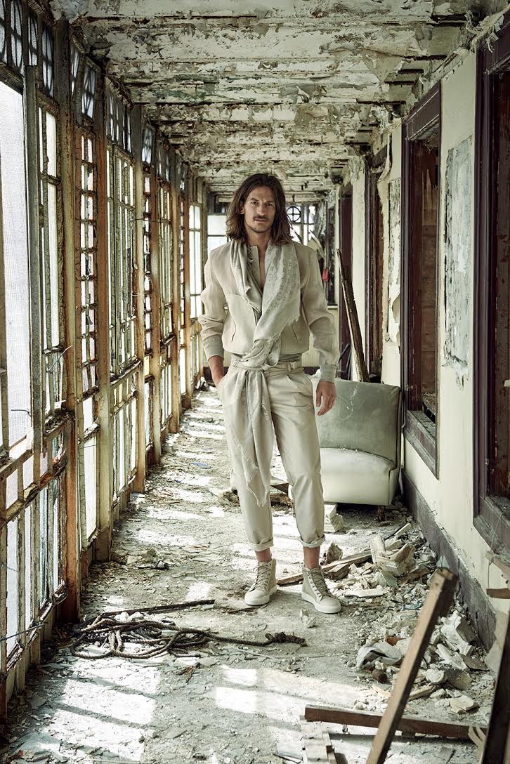 Neutral fashions are front and center for a new editorial for the April 2016 issue of GQ Portugal. Australian model Jarrod Scott channels a creative spirit as he takes to a barren building. Photographed by Branislav Simoncik, Jarrod is styled by Jan Kralicek. Embracing the soft attributes of the season, Jarrod is captured in neutrals. Kralicek brings together neutrals, highlighting relaxed tailoring from Louis Vuitton, Calvin Klein Collection, Ermenegildo Zegna and more. / Grooming by Elodie Fiuza.