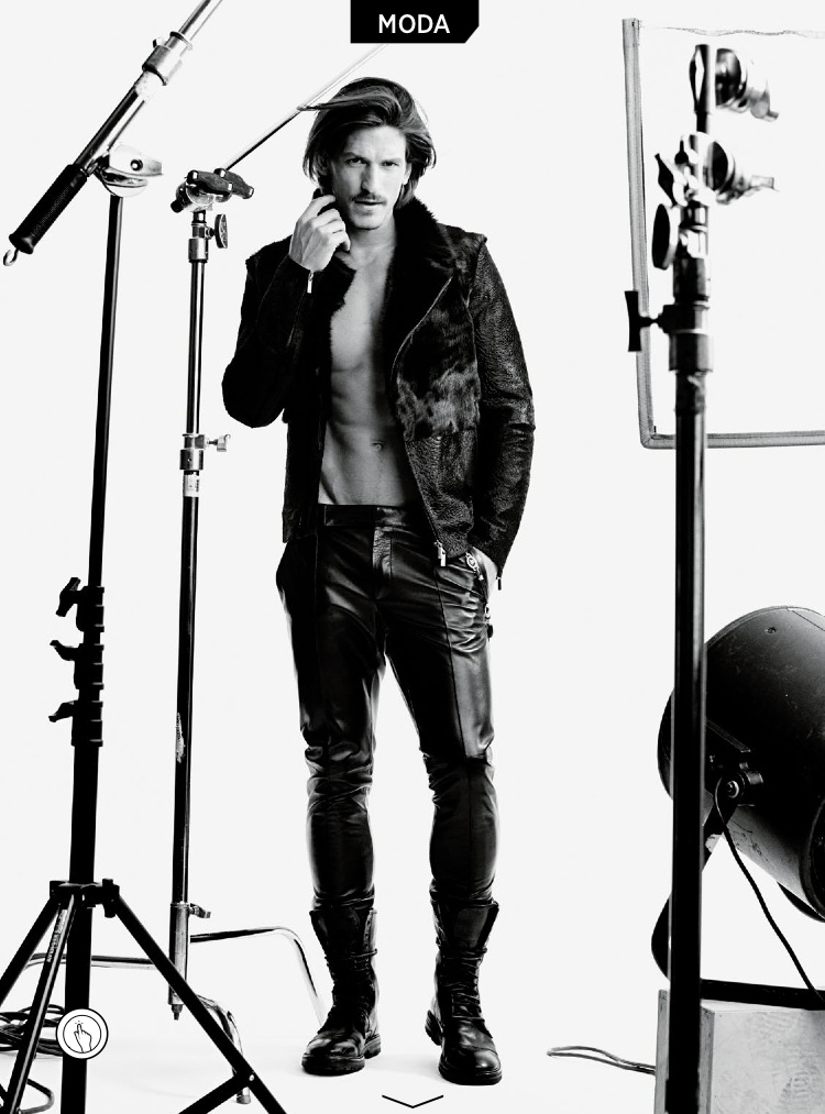 Let’s Go Black!-The July issue of GQ Brasil features a fashion story styled by Joseph Episcopo, starring Australian model Jarrod Scott. Connecting with photographer Matthew Scrivens, Jarrod is captured in an ideal backstage of a fashion shooting. Wearing a wardrobe of all black designs, Jarrod displays how to wear black leather for the next season. From the timeless rebellious attitude of a biker jacket, to the daring vibe of studded numbers, Jarrod’s passion for leather also includes slim trousers, paired with a sartorial suit jacket, decorated with graphic stripes, and polished ankle boots. / Grooming by Scott McMahan.