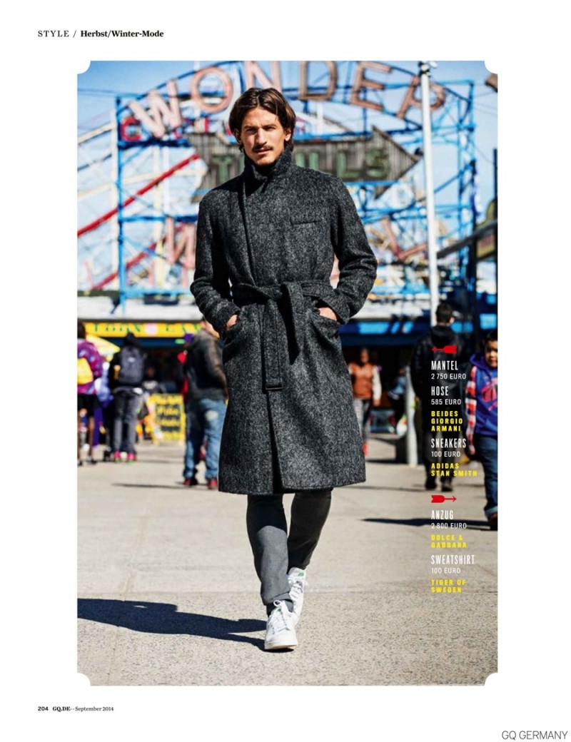 Eye-catcher-Gracing the pages of GQ Germany’s September 2014 issue, Australian model Jarrod Scott embraces standout fall looks in a story photographed by Ben Watts. The Australian model enjoys a day in a fun fair for this outdoor story, styled by GQ’s Tobias Frericks, who assembles for the occasion a wardrobe made of slim-fitted suits, matched with ultra white sneakers, silk bomber jackets, textured coats, sportswear-inspired numbers and glamorous tuxedos. Getting snapped in pieces from the likes of Giorgio Armani, Dolce & Gabbana, Brioni and several other luxury labels, Jarrod perfectly showcases this season’s multifaceted attitude. / Grooming by Staci Child.
