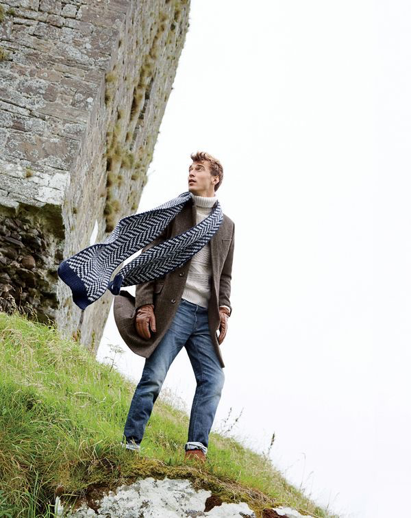 Clément wears J.Crew men’s Ludlow topcoat in brown glen plaid, Guernsey turtleneck sweater, Wallace & Barnes slim selvedge jean in Riverland wash, wide chevron scarf, Alden® Michigan boots and leather work gloves.
