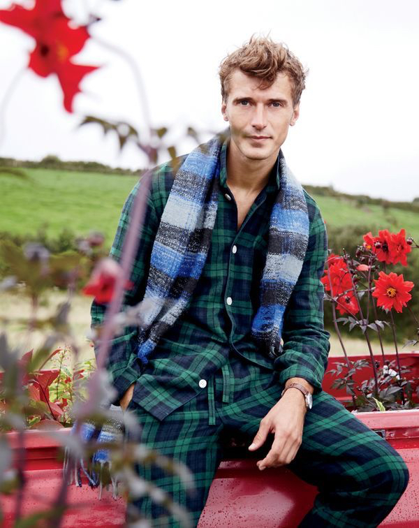 Clément wears J.Crew men’s flannel pajama set in Black Watch, plaid scarf and Timex® for J.Crew 1600 watch.Pin