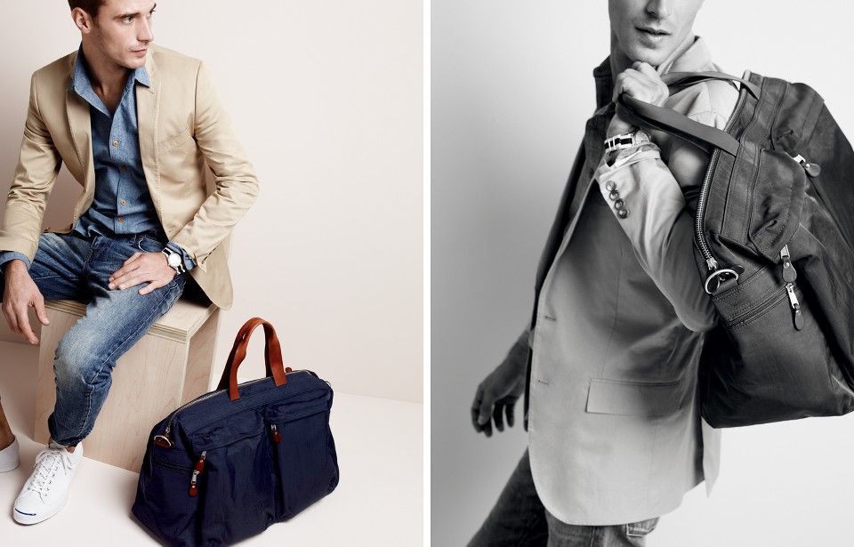 The Everywhere Bag: Clément Chabernaud wears Harwick Weekender Bag, Ludlow Suit Jacket with Double Vent in Italian Chino, Rustic Cotton Shirt in Solid, 770 Jeans in Leroy Wash, Converse Jack Purcell Signature Sneakers, Timex for J.Crew Vintage Field Army Watch and Striped Watch Strap, all from J.Crew.
