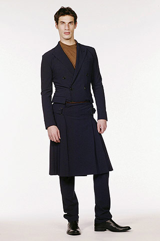 Fall 2005: Gaultier pairs his kilt with a tailored double-breasted jacket for a sleek image.Pin