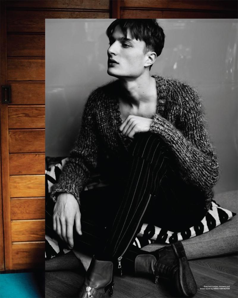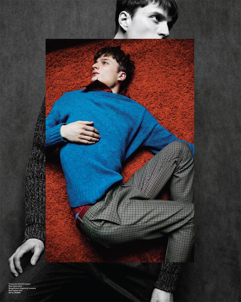 The New Knitwear–Season after season, knitwear is revisited by many fashion designers, that try to combine the softness of the yarns with new and hi-tech ways to work them, in order to revamp this essential garment, without losing its functional appeal. Next season’s knits are the subject of this story, lensed by Jeff Hahn, which is included in Rollacoaster’s latest issue. Teaming up with stylist Andrew Davis, Hahn captures Elite London model Almantas Petkunas in a selection of fall knits, playing with the contrast between colors and textures. From Gucci’s pea green jumpers and black leather trousers, Prada’s checked shirts and minimal jumpers or Raf Simons’ colorful shirts and fairy tales inspired motifs that decorate sleeveless jumpers, fall knitwear shows its multifaceted allure and an eclectic and fashionable twist. / Photography assistance by Pierre-Luc Moisan. Styling assistance by Giulia Oddi and Sam Carder. Grooming by Chris Sweeney.