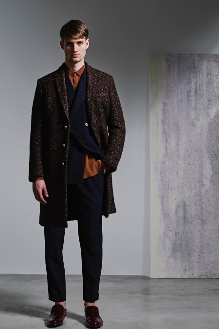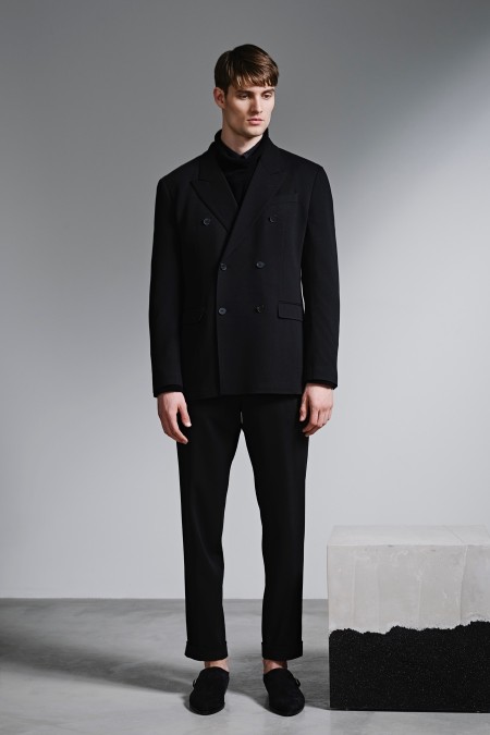 Jeffrey Rüdes looked to redefine masculine glamour for its fall-winter 2016 collection. The key was found in a wardrobe that honed in on various textures and rich fabrics. Embracing an elegant attitude, suiting and outerwear were the star attractions. Velvet, suede and leather were the choice textiles, dressing statement pieces such as Jeffrey Rüdes’ crust suede officer coat and velvet chesterfield coat. One of the season’s top trends, shearling also played a key role, lining sharp coats and jackets, adding a luxurious pop to oversized collars.