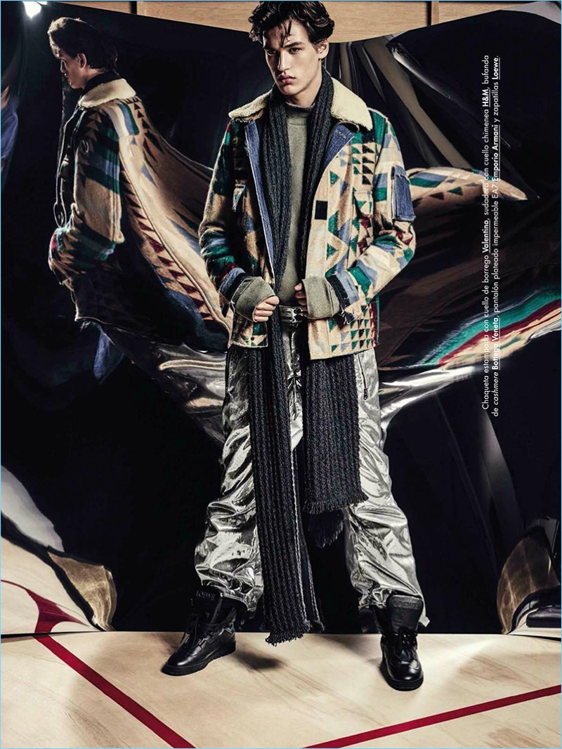 Mixing various styles, Jegor Venned wears a Valentino jacket with a H&M scarf, Bottega Veneta sweater, silver EA7 Emporio Armani pants, and Loewe sneakers.