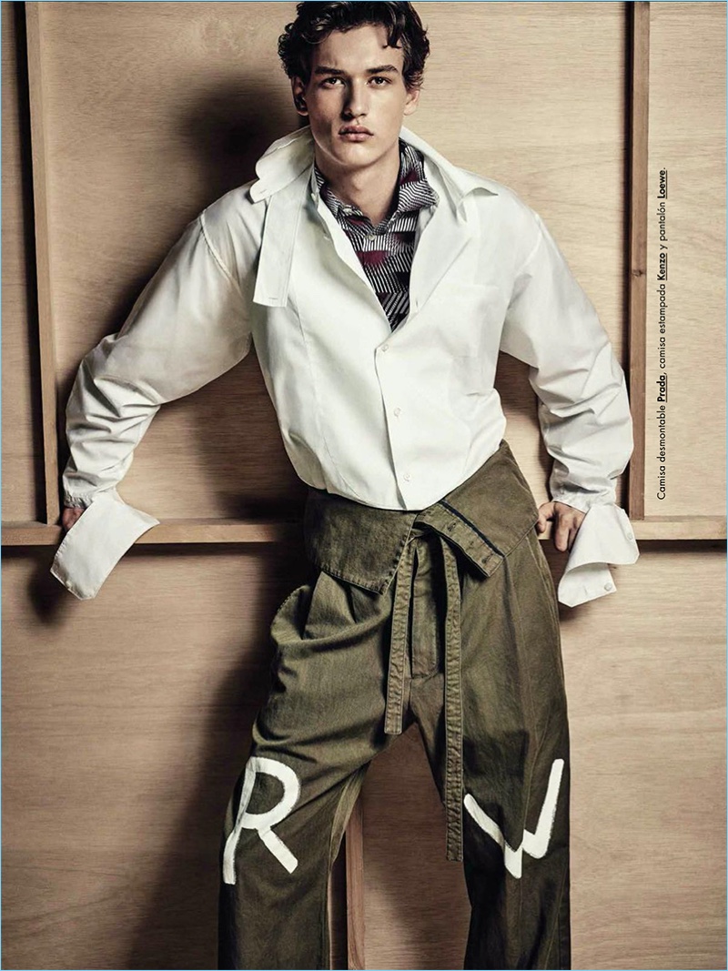 Jegor Venned sports a white Prada shirt with a patterned Kenzo shirt, oversized trousers by Loewe.