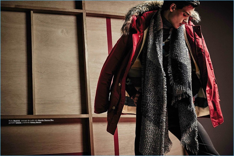 Jesus Cicero outfits Jegor Venned in a red Woolrich parka, Moncler Gamme Bleu sweater, Lemaire pants, and an Antony Morato scarf.