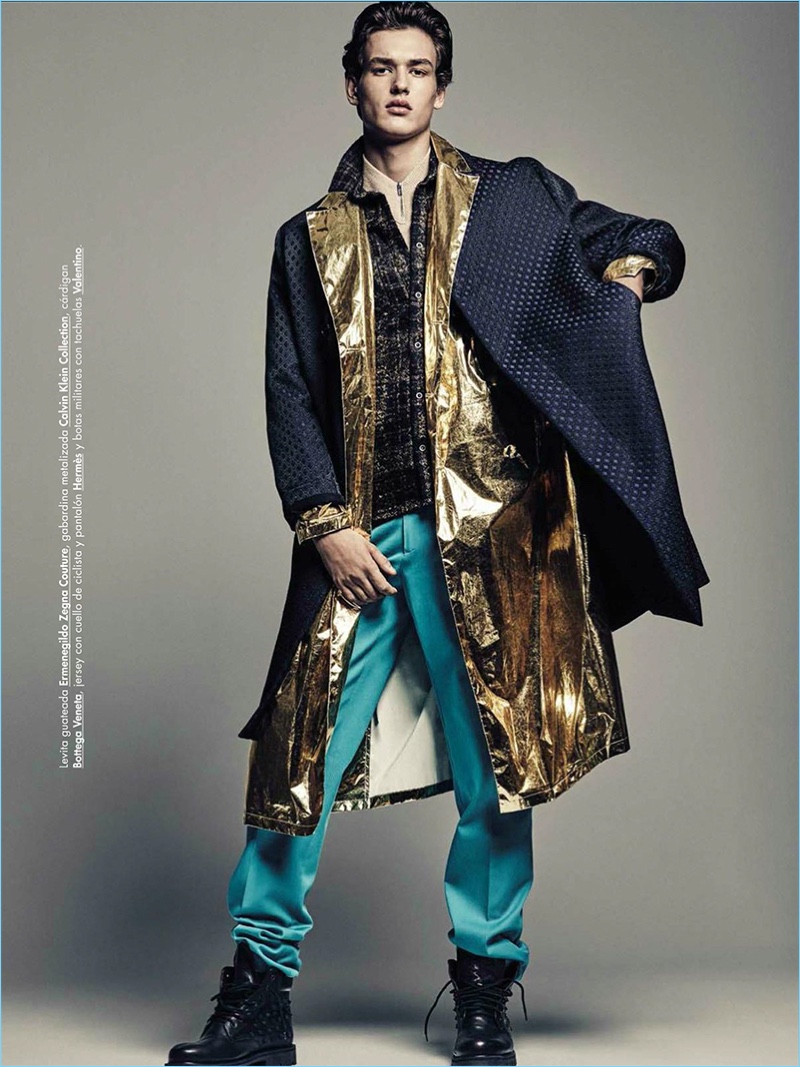 Model Jegor Venned makes a loud statement in an Ermenegildo Zegna Couture coat, which is worn over a foil gold coat by Calvin Klein Collection. The model up and comer embraces more color with Bottega Veneta trousers.