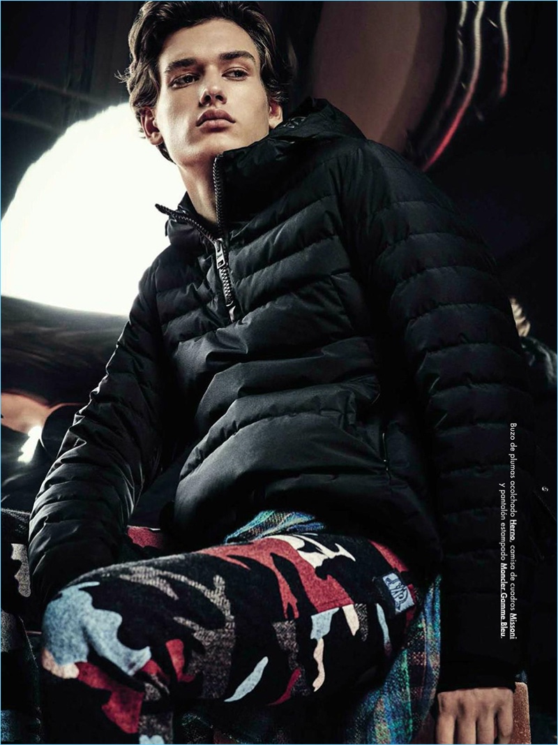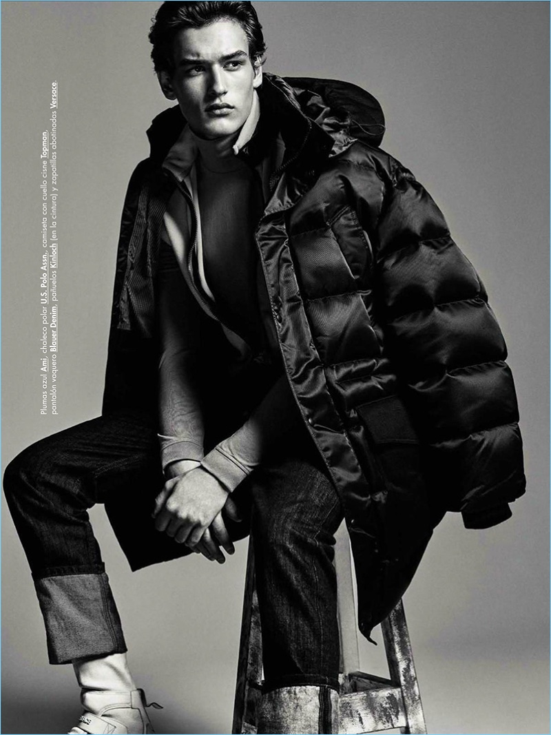 Sitting for a serious photo, Jegor Venned rocks a U.S. Polo Assn. jacket with layers of fashions from labels such as Ami and H&M.