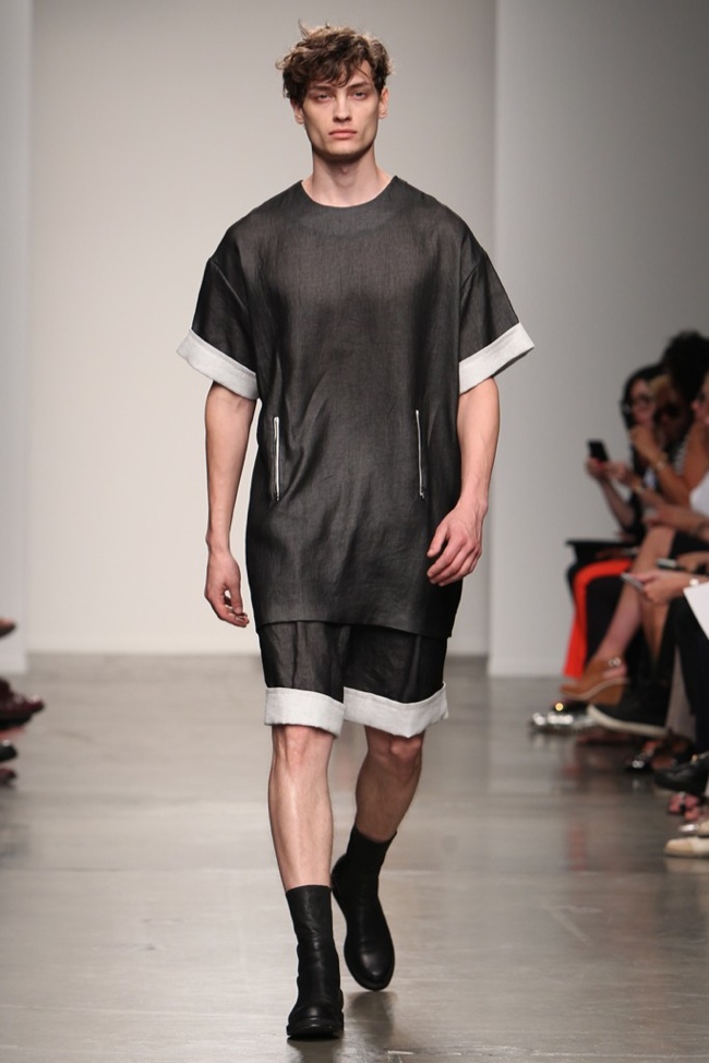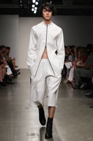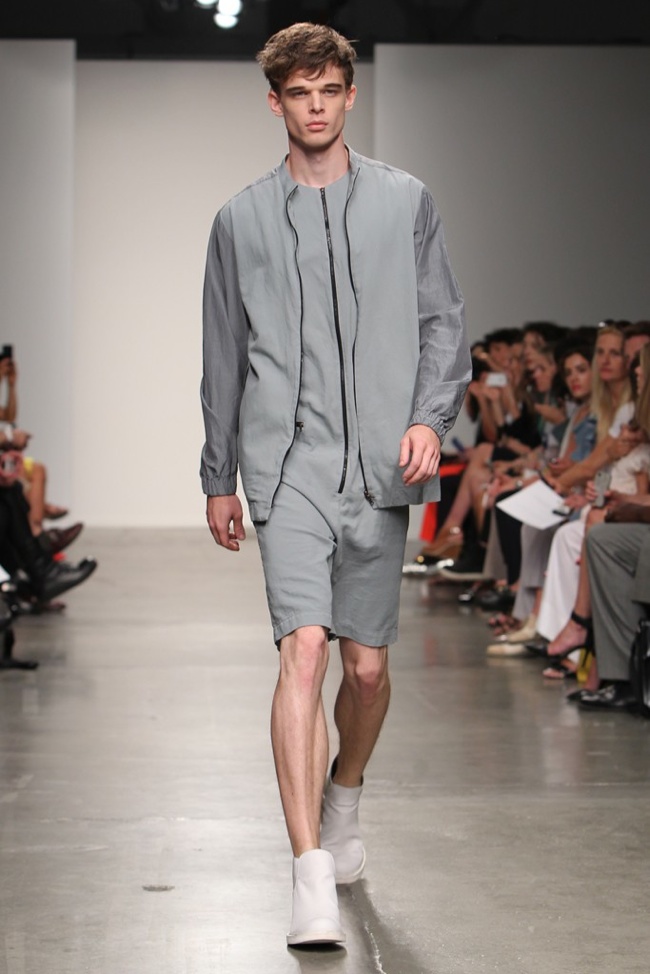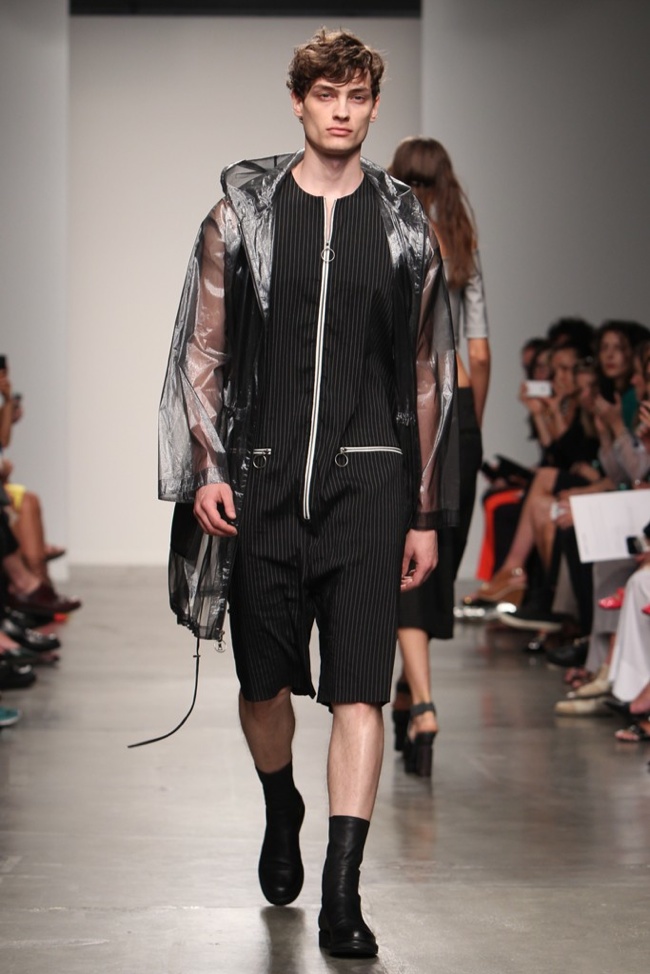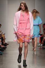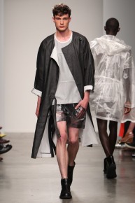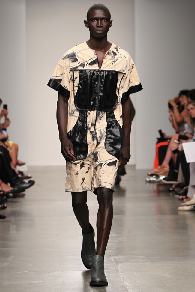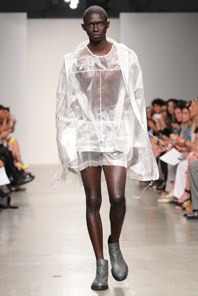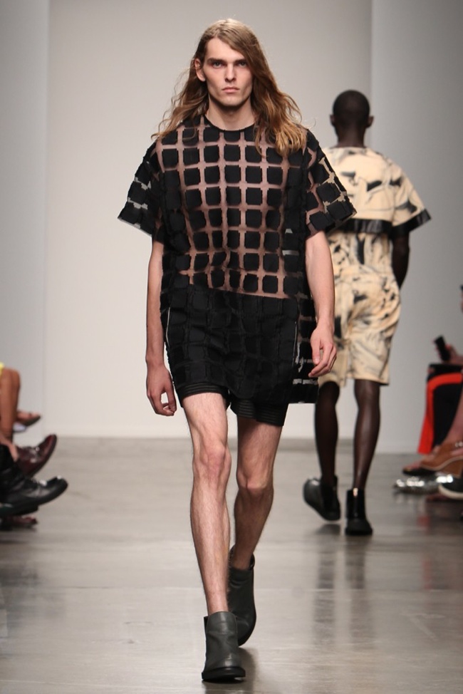 90’s Baby–Bringing a fresh male perspective to New York Fashion Week, Canadian designer Jeremy Laing launched his spring/summer 2014 menswear collection, touching upon 1990s inspirations for a youthful foray that captured the ease and style of summer. Approaching the season with dark colors that opened up to bright warm hues, Laing created oversized silhouettes that resonate with today’s street style culture. Here boxy tops made a statement with great shapes and a fine attention for details, occasionally playing with sheer fabrics. Mixed with loose-fitting shorts and lightweight outerwear that can double as a fun top, Jeremy Laing revealed a strong launch.