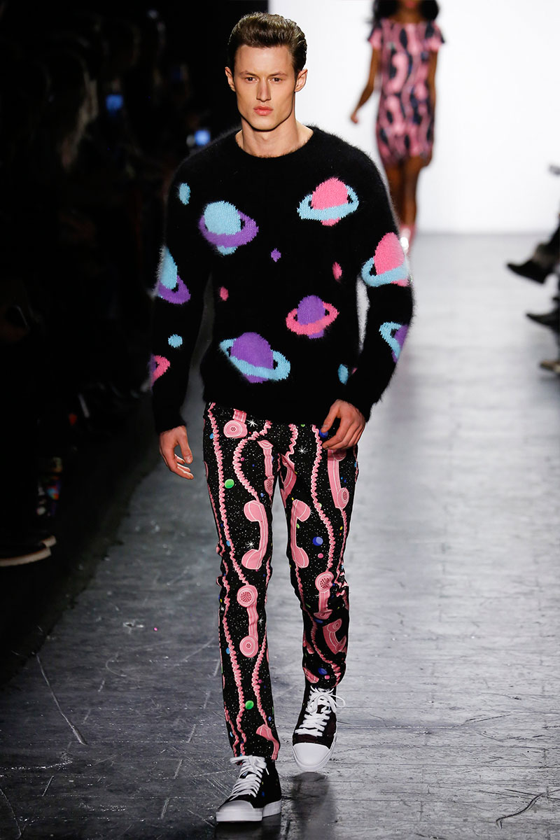 Jeremy Scott unveiled a small selection of menswear alongside his womenswear during New York Fashion Week. Approaching his fall-winter 2016 collection, the designer adopted an eclectic mindset, mixing references for quite the bold outing. One component of the range revolved around animal prints, turning out a leopard print varsity bomber jacket and a fuzzy take on the biker jacket. Scott also went galactic with 80s style graphics of planets, combined with patterns featuring pink telephones and grooming products.