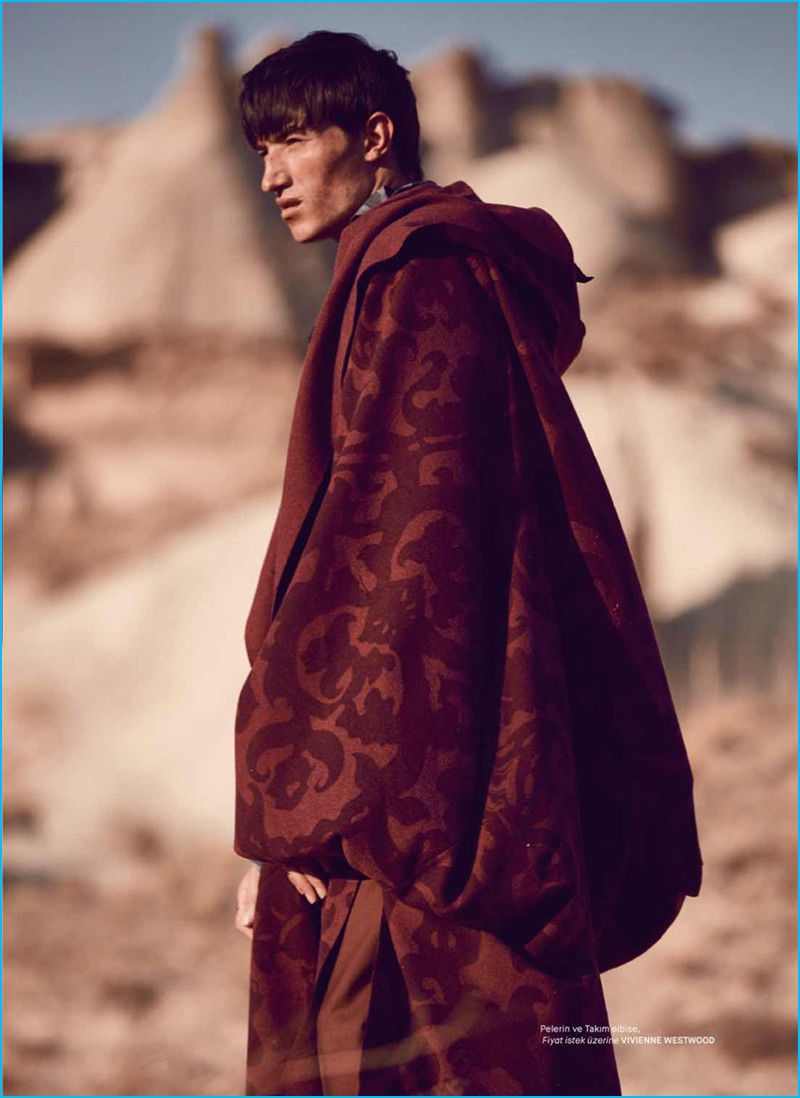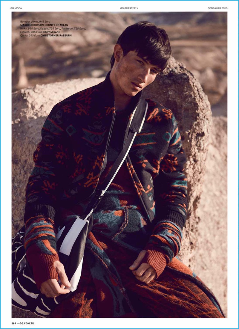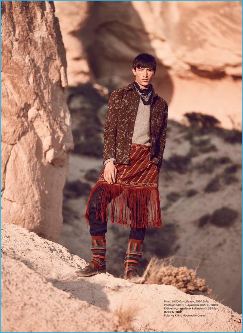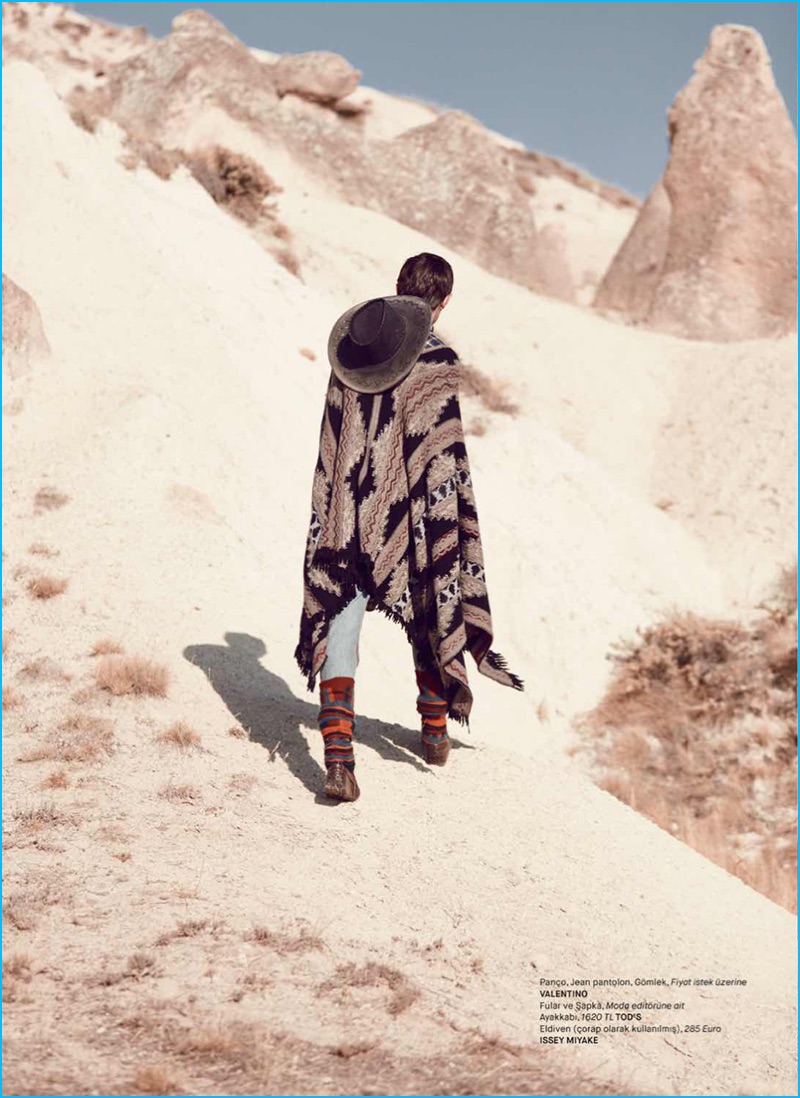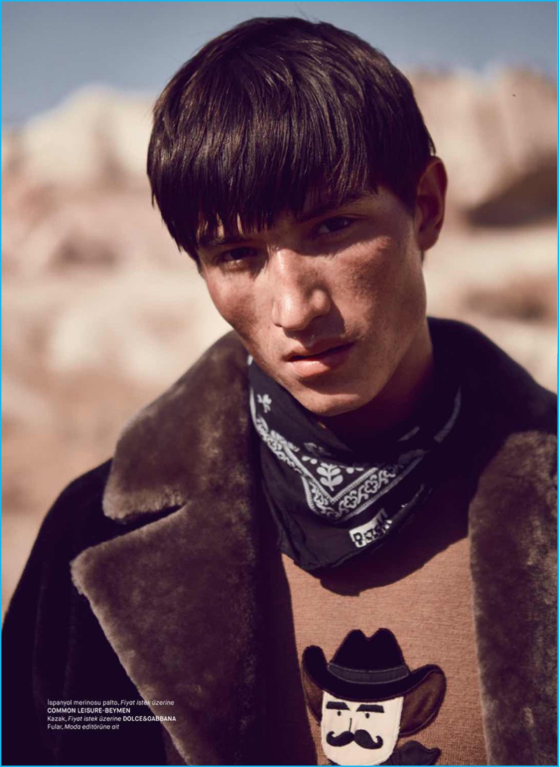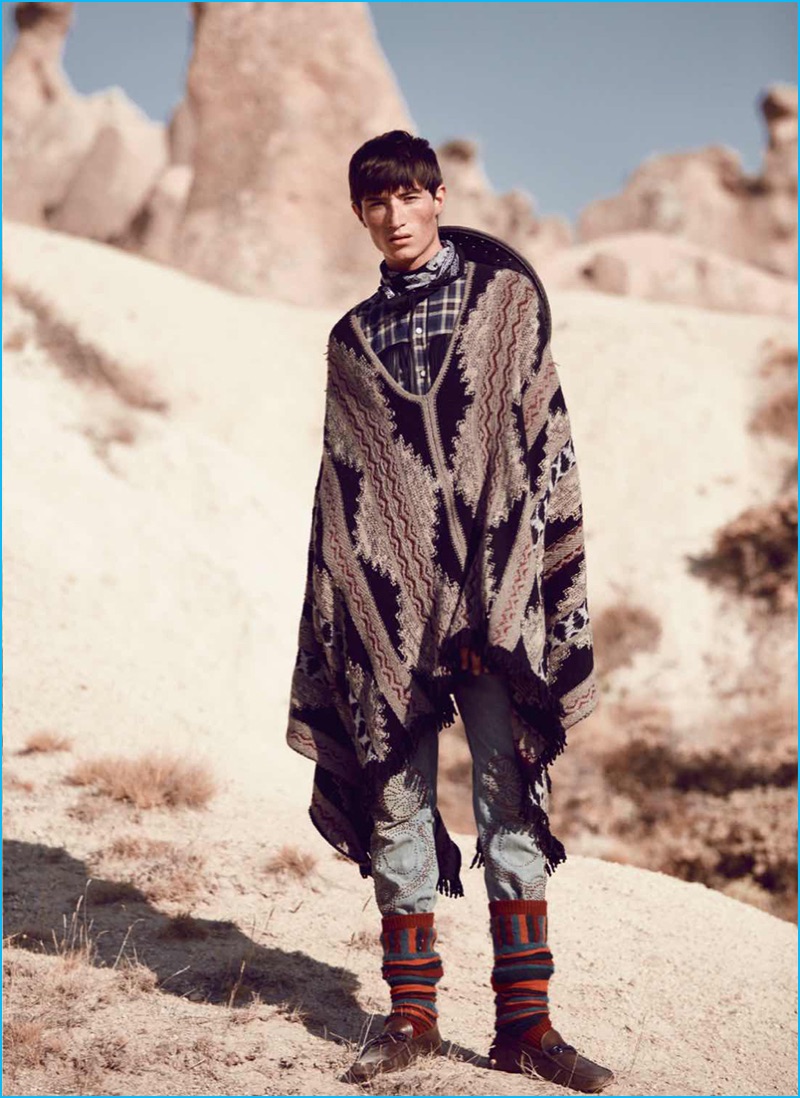 The popular western motif receives a contemporary update with a new fashion spread. GQ Turkey enlists model Jester White for an arresting editorial. The English model connects with stylist Kaner Kivanç for an outdoors shoot. Collaborating with photographer Koray Birand, Kivanç outfits Jester in a wardrobe of fall standouts. Championing designer statement pieces, the edit features items such as Valentino’s must-have poncho and Dolce & Gabbana’s cheeky western-inspired sweater.