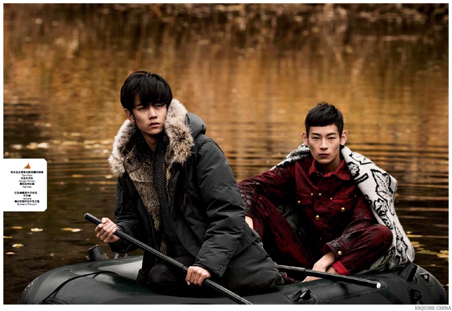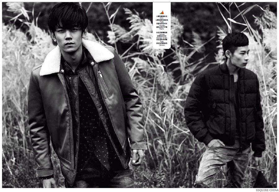 Photographed by Hengyi Liang for the December 2014 edition of Esquire China, models Ji Lingchen and Li Jin come together in fantastic winter fashions. Bundling up in puffer jackets, suede vests and more, the boys are outfitted by Will Wu, wearing the latest from labels that include Lacoste, Louis Vuitton, Moncler, Replay and Dolce & Gabbana. / Makeup by Li Xinyuan.