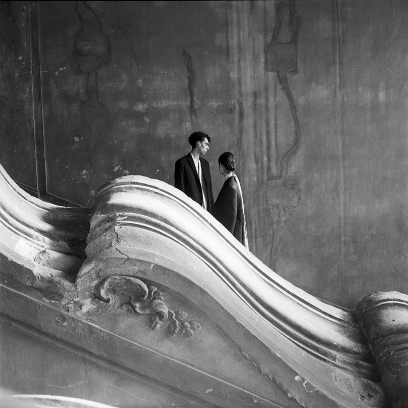 mirrored in the sights of Sicily. Photographed by Olivier Kervern, models Damien Medina and Saana Mirzaie front the advertisement. Damien dons clean tailoring and longline shirts with the character of a subtle print for the occasion.