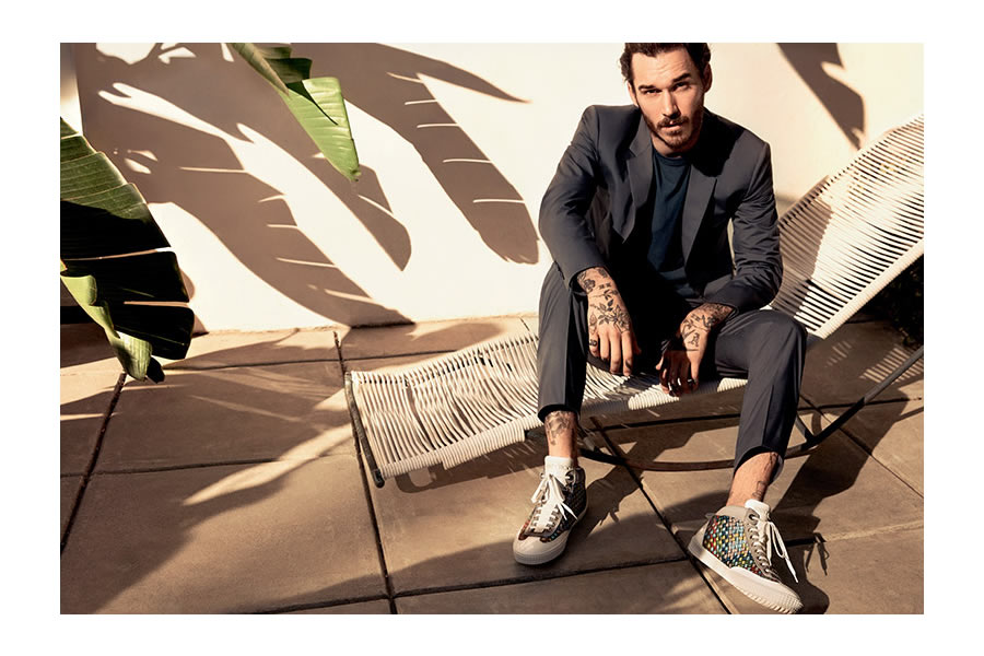 Jimmy Choo shifts creative gears for its spring-summer 2016 campaign. The luxury footwear brand teams up with creative agency Laird + Partners for its advertisements, which were shot in sunny Los Angeles, California. Model David Alexander Flinn fronts the outing, connecting with fashion photographer Cass Bird. Relaxing outdoors, David is captured in a slim suit and a pair of white patterned dress shoes.