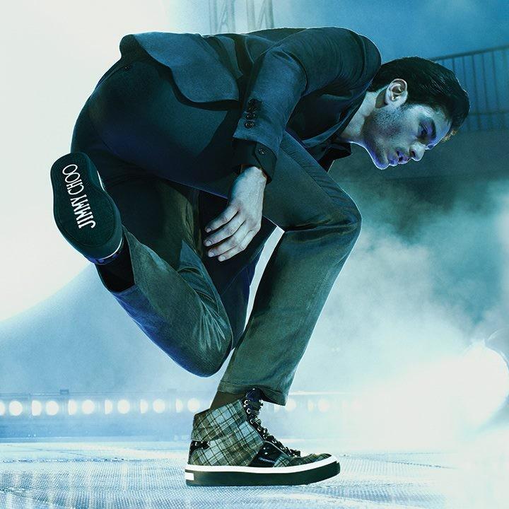 Following two seasons with Game of Thrones actor Kit Harington as the face of its campaigns, Jimmy Choo goes the model route for fall-winter 2015. Leading American model Tyson Ballou steps into Jimmy Choo’s shoes for a head over heels outing. The first image from the advertisement shows Tyson hitting quite the pose as he shows off the brand’s tartan print hi-top sneakers, including their logo adorned sole.