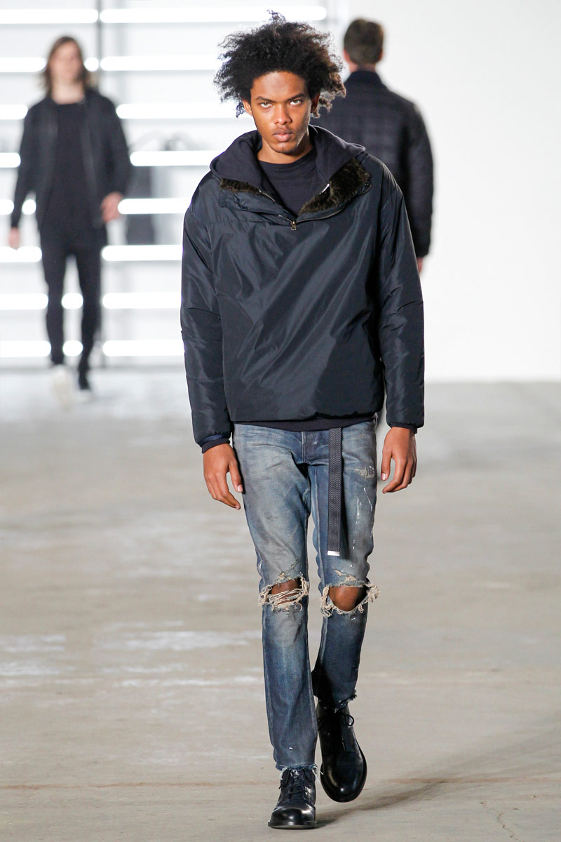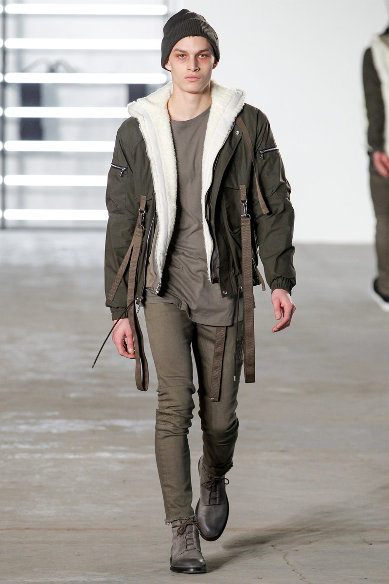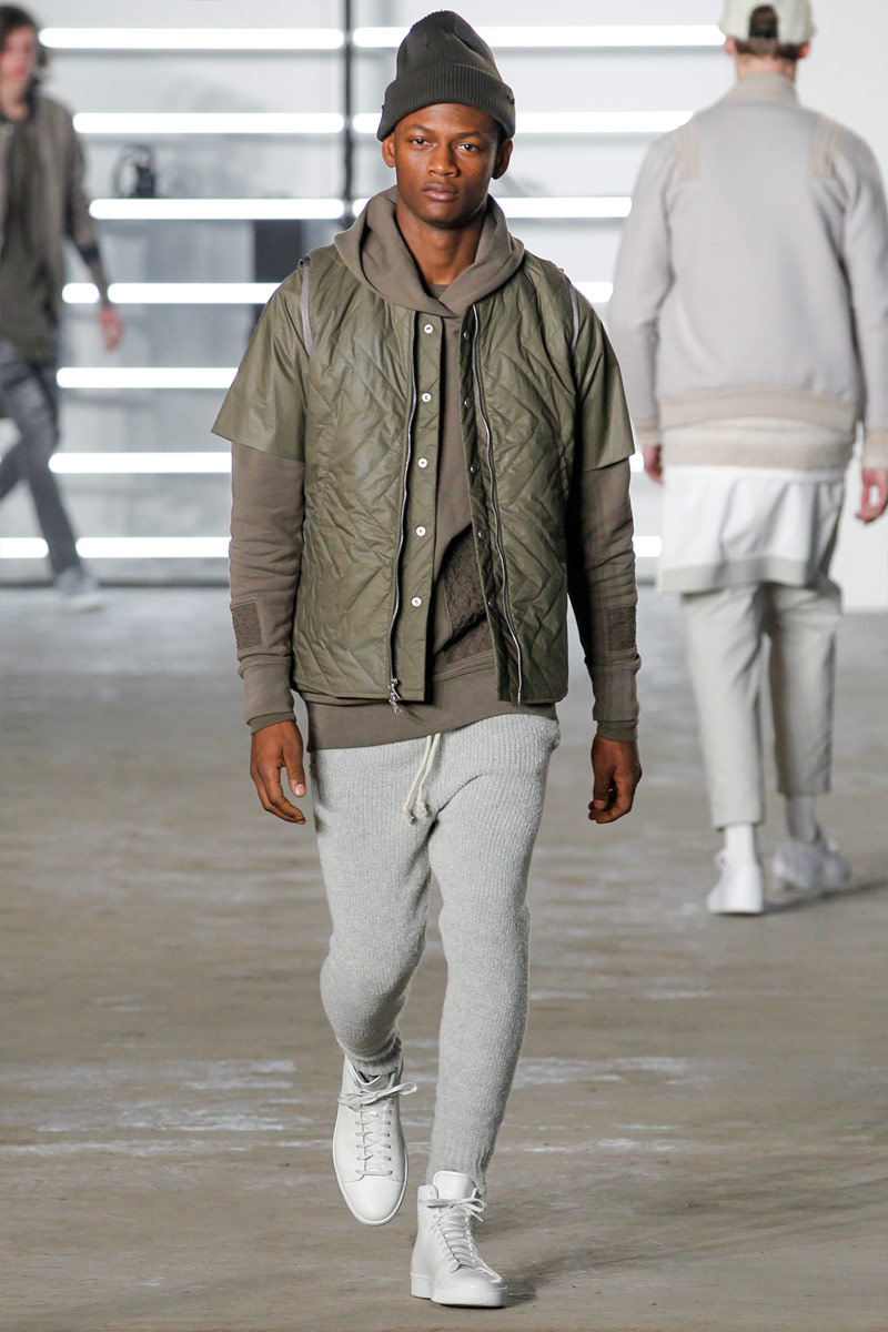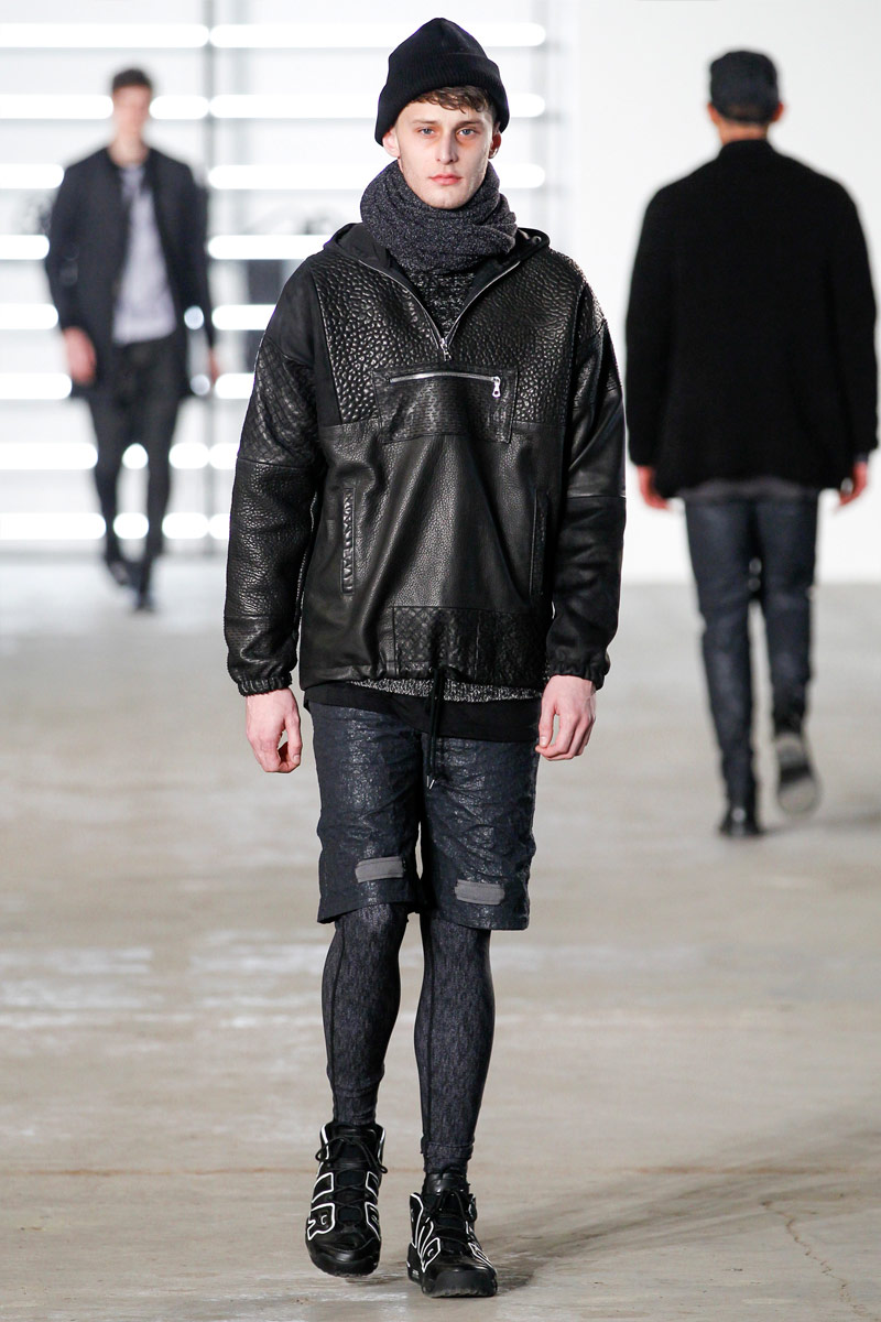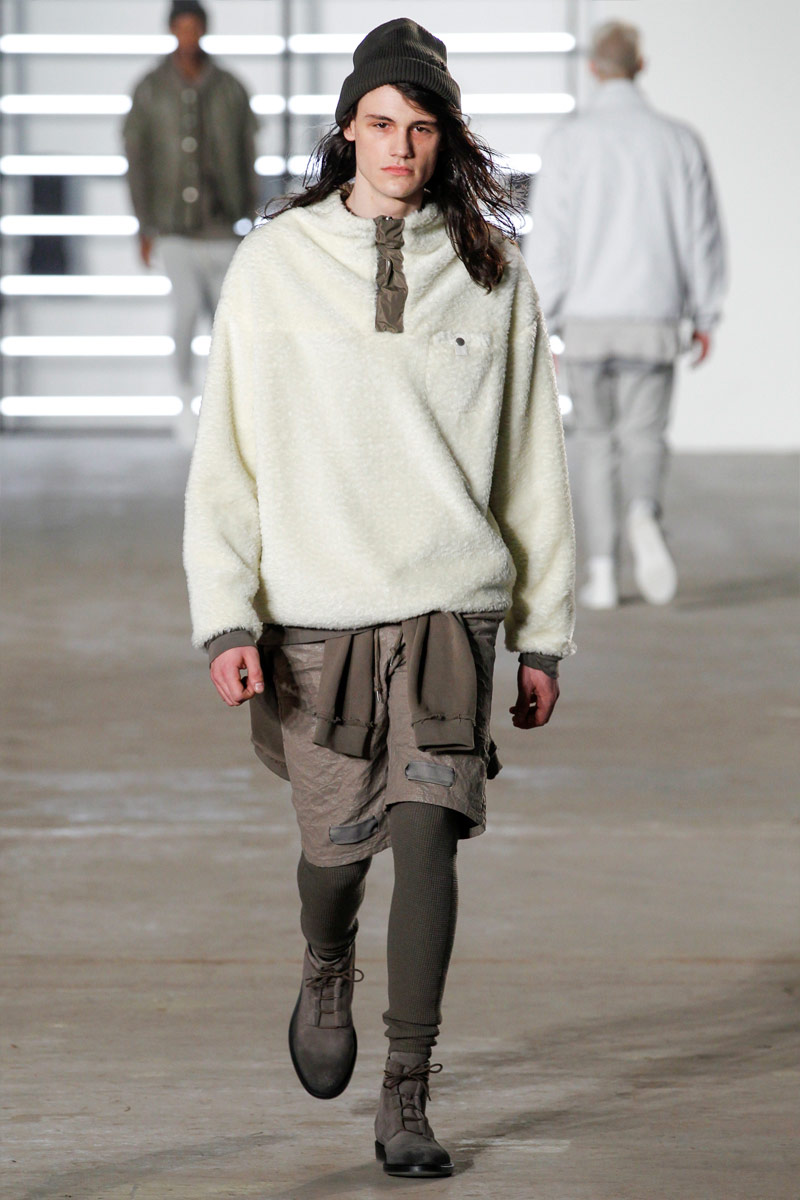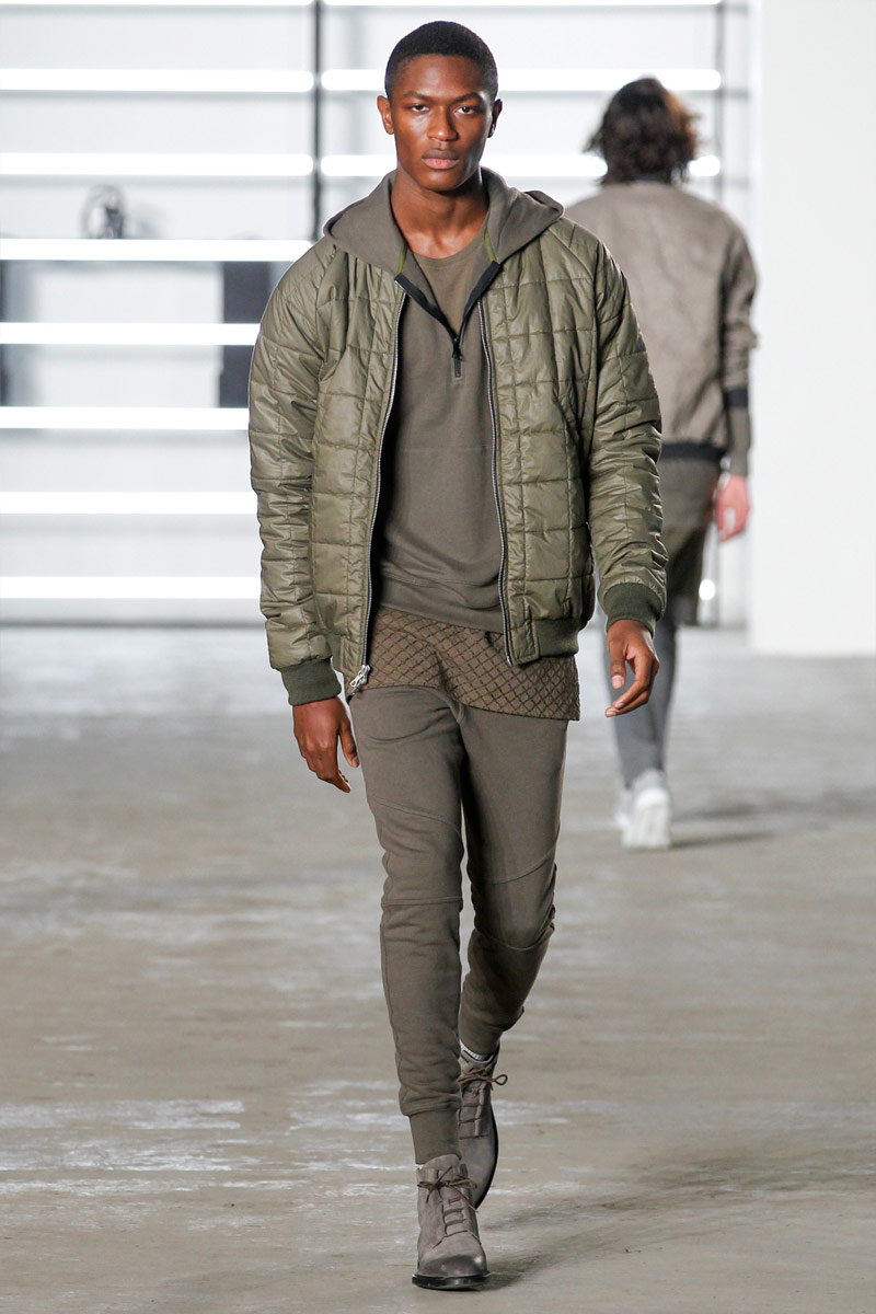 John Elliott approaches fall-winter 2016 with an evolution of layers. From a neutral take on athleisure style to contemporary military inspirations, Elliott serves up an array of reversed shearling outerwear, slim-cut trousers, shorts over leggings and short-sleeve jackets. Touching on shades of grey before taking a dark turn, the collection has plenty of staples, ranging from joggers to quilted outerwear. Adding a luxe spin to sporty essentials, leather and a dark color palette lend the collection its special quality. Here, leather bombers, hooded jackets and more are juxtaposed with moto style pants, oversized knitwear and denim jeans for a spectacular fall showing.