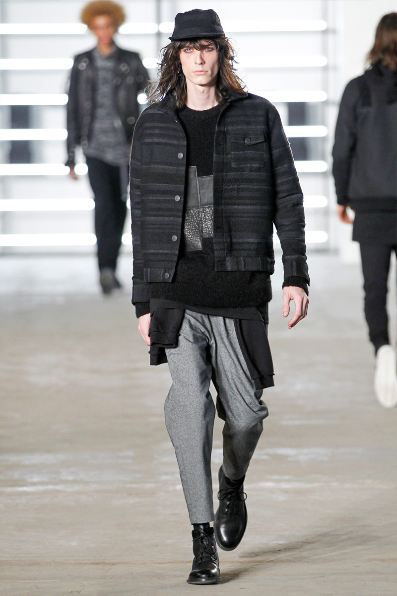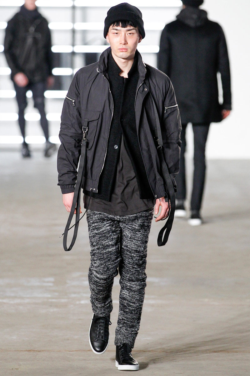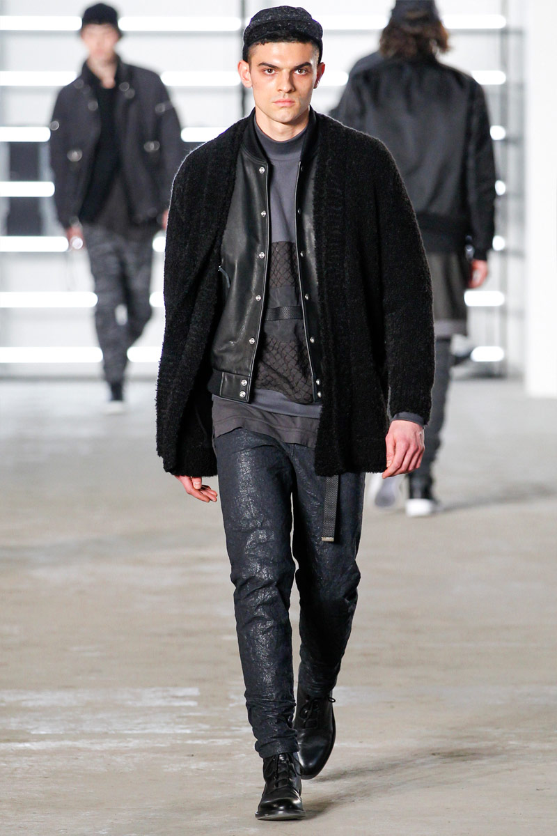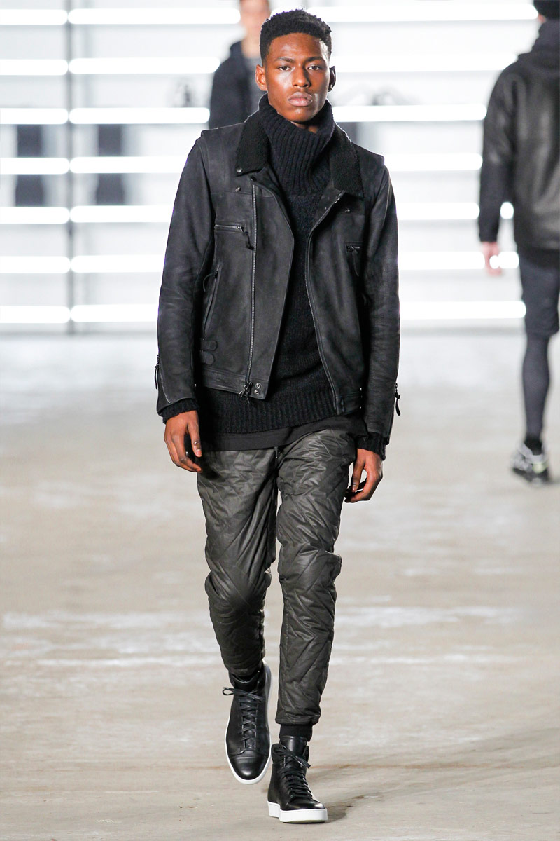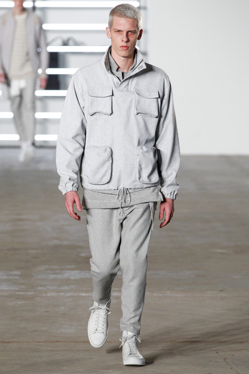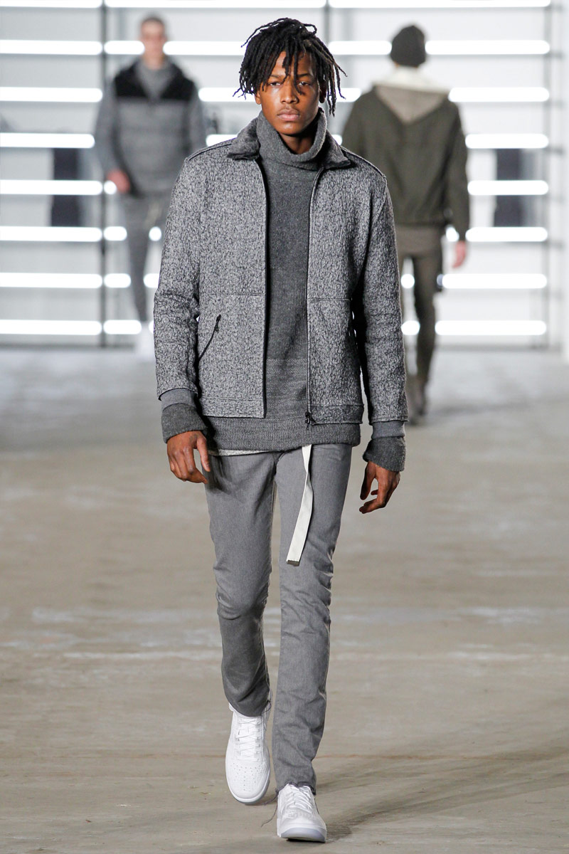 John Elliott approaches fall-winter 2016 with an evolution of layers. From a neutral take on athleisure style to contemporary military inspirations, Elliott serves up an array of reversed shearling outerwear, slim-cut trousers, shorts over leggings and short-sleeve jackets. Touching on shades of grey before taking a dark turn, the collection has plenty of staples, ranging from joggers to quilted outerwear. Adding a luxe spin to sporty essentials, leather and a dark color palette lend the collection its special quality. Here, leather bombers, hooded jackets and more are juxtaposed with moto style pants, oversized knitwear and denim jeans for a spectacular fall showing.