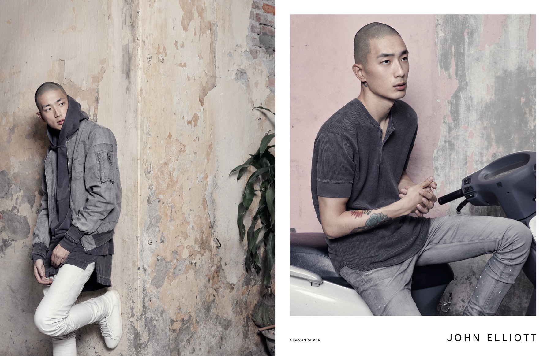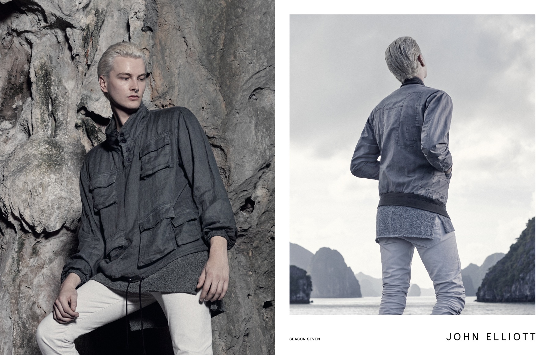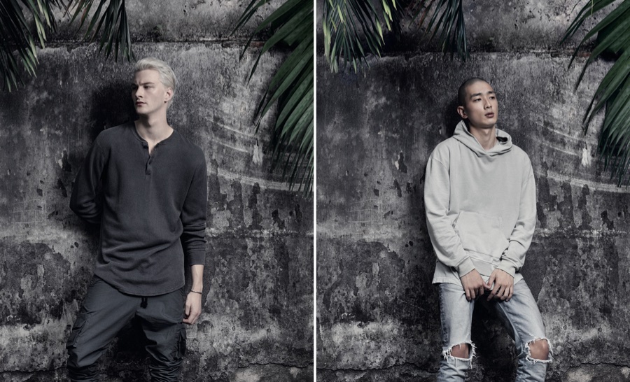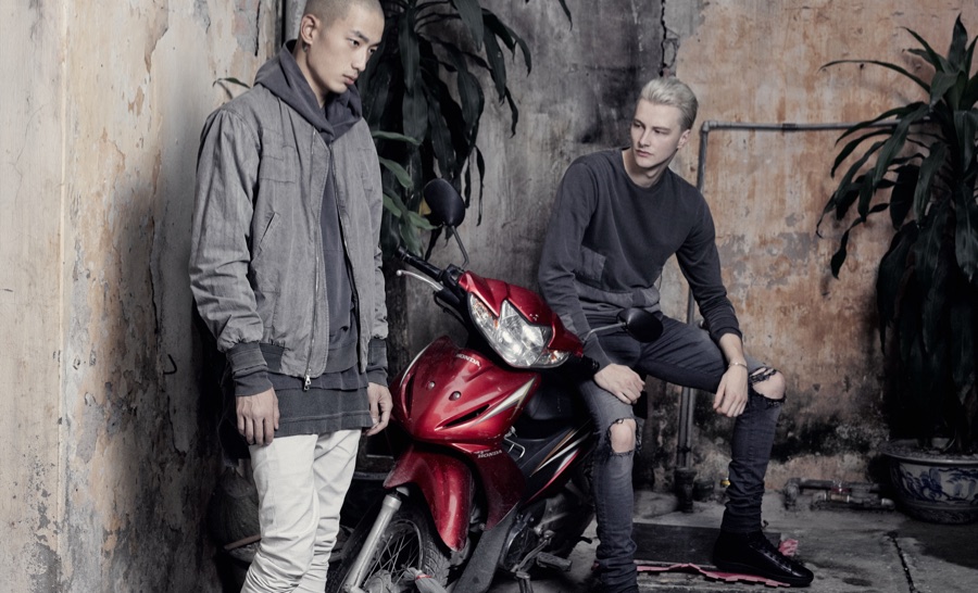 John Elliott visits Vietnam for its spring-summer 2016 advertising campaign. Featuring its sporty gray fashions, the ad was shot by Los Angeles-based photographer Patrick Maus. Undertaking the cool, relaxed aesthetic of Elliott are models Sung Jin Park and Benjamin Jarvis. The pair traveled to Hanoi and Halong Bay, Vietnam for the new campaign. Captured against rocky terrain, Sung and Benjamin model a wardrobe of hooded sweatshirts, bomber jackets, elongated tops and slim-cut pants.