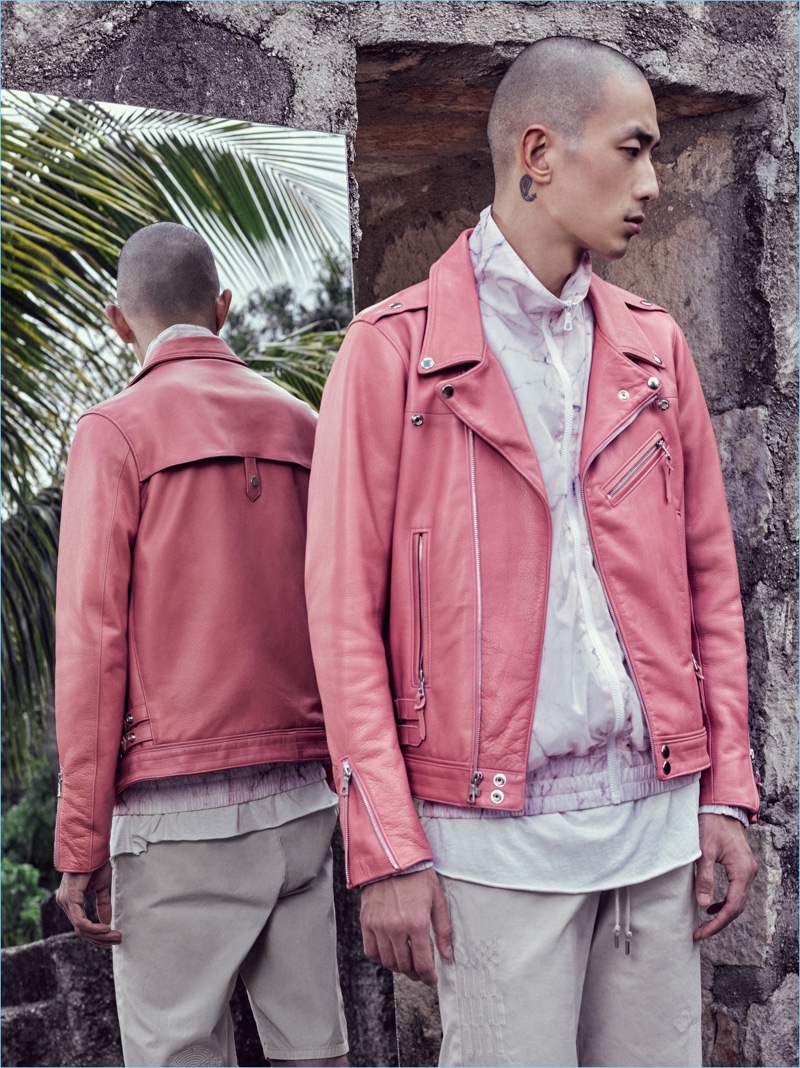 Sung Jin Park rocks John Elliott’s statement pink leather biker jacket for spring-summer 2017.