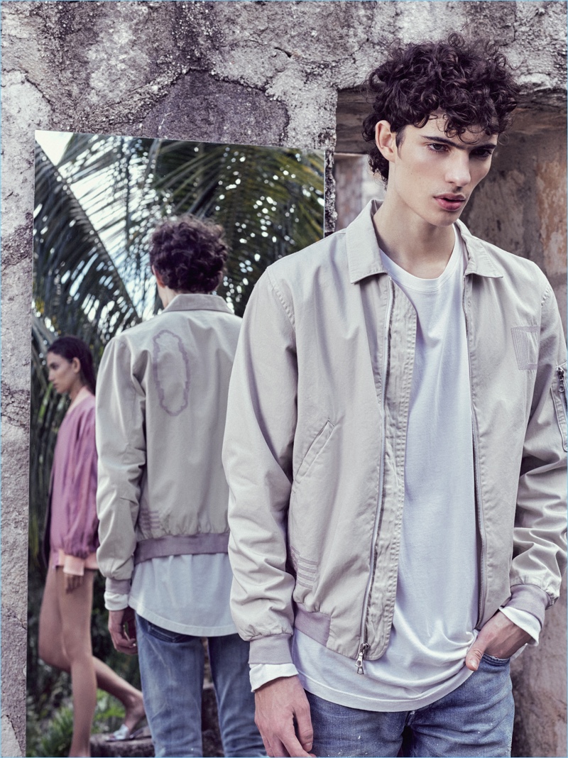 Venturing outdoors, Piero Mendez wears a bomber jacket with frayed denim shorts from John Elliott.Pin