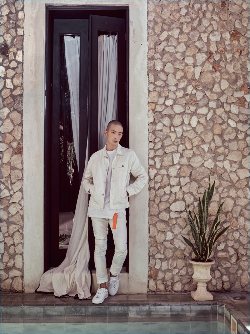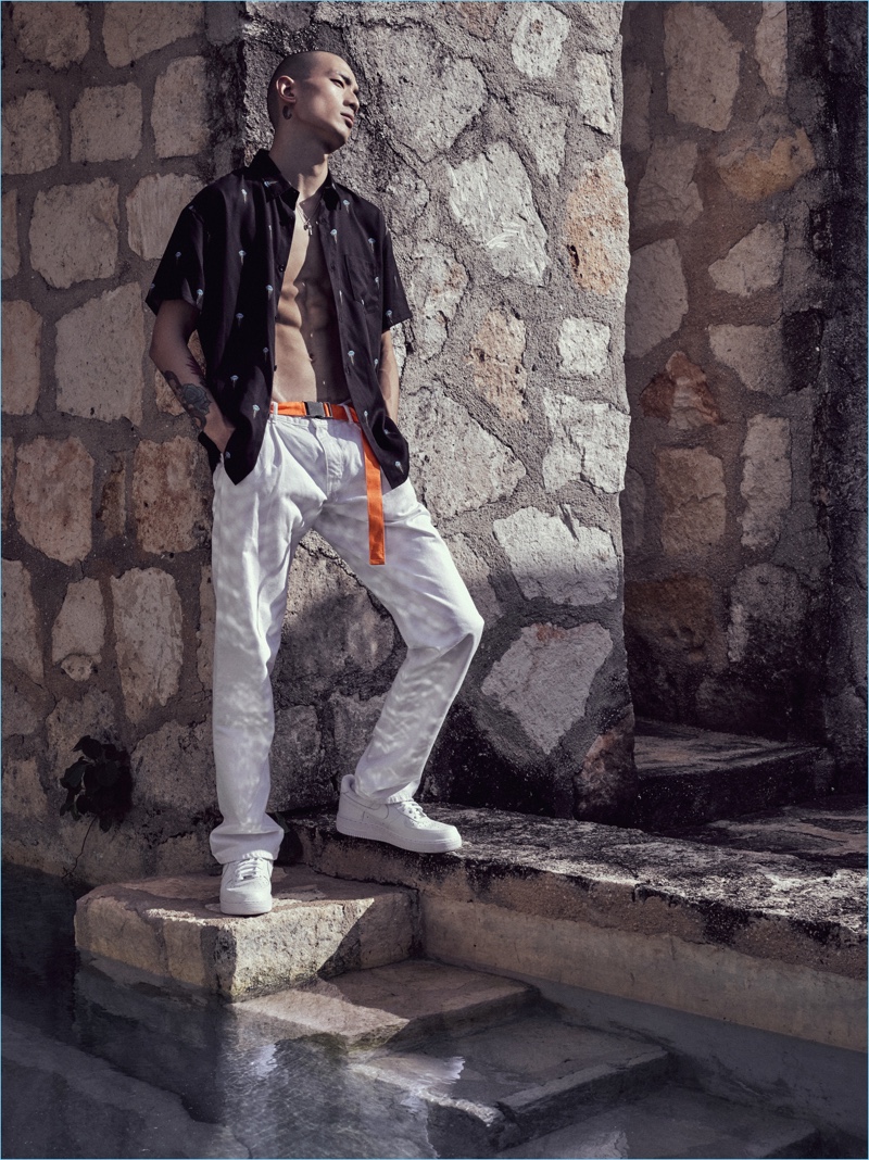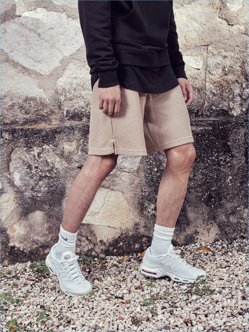 Korean model Sung Jin Park sports a black hoodie with khaki shorts by John Elliott.